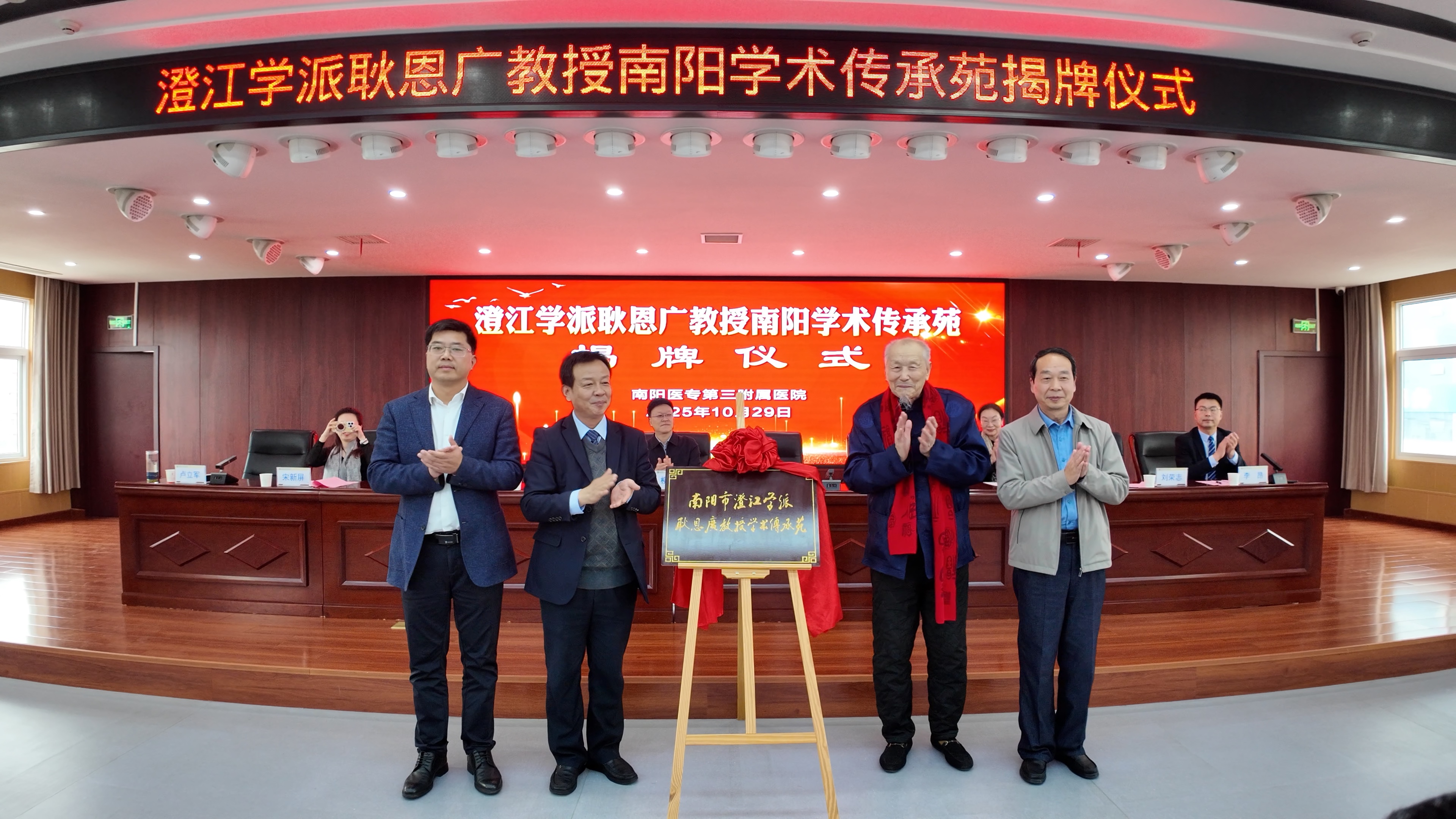 本网讯(文/三附院 韩冰)10月29日,澄江学派耿恩广教授南阳学术传承苑揭牌仪式暨全市中医适宜技术(特色疗法类)培训会在我校三附院举行。我校党委书记柳明伟,北京中医药大学针灸推拿学院教授耿恩广,南阳市中医药管理局副局长崔松涛,南阳市城乡一体化示范区党工委委员法聚明,我校副校长刘荣志、三附院书记卢立军等领导专家出席,与京豫两地中医药同仁共同见证这一重要时刻。