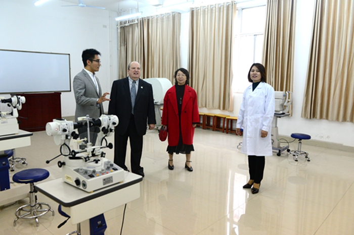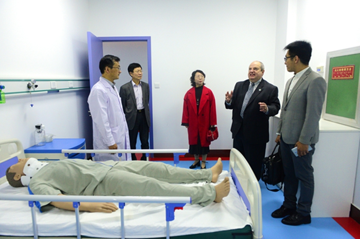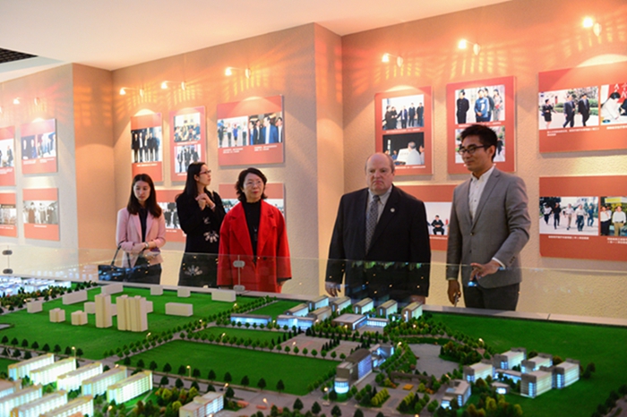 方校长和罗伯特.克拉克校长分别介绍了两校的基本情况,双方就中外合作办学项目教学管理、学生和教师交流培训、课程和学分对接等事项进行了广泛深入的洽谈,并举行合作项目签约仪式。访问期间,罗伯特.克拉克校长一行还实地考察了我校临床医学系、护理系、医技系、针灸骨伤系人体生命科学馆、中药标本馆、仲景文化特藏馆、一附院、二附院等教育教学部门和场馆。22日上午,罗伯特.克拉克校长在新东区礼堂做了一场关于美国大学教育的讲座,国际教育学院近600名师生现场聆听了讲座,许多学生积极与罗伯特.克拉克校长进行了交流与沟通。
