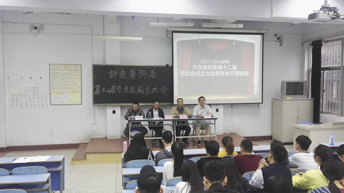 党总支书记毕跃忠致辞。他指出,在全国喜迎党的十九大即将召开之际,举办针灸骨伤系新一届学生会成立暨培训大会具有重要的意义。面对新的机遇,新的任务,新的挑战,全体学生会成员要继续发挥好联系学校与学生的桥梁和纽带作用:准确定位,明确职责,做好服务师生工作;严于律已,积极进取,发挥模范带头作用;勇于担当,务实苦干,不断增强组织凝聚力;团结协作,自强不息,充分发扬无私奉献的精神。系学工办主任燕远伟宣读了《针灸骨伤系关于第十二届团总支学生会成员任免通知》;学生代表王禹华带领全体学生会成员进行了庄严的宣誓活动,新一届学生会成员代表姬雅静、张丽、张子怡同学分别做了代表性发言。