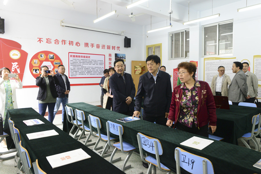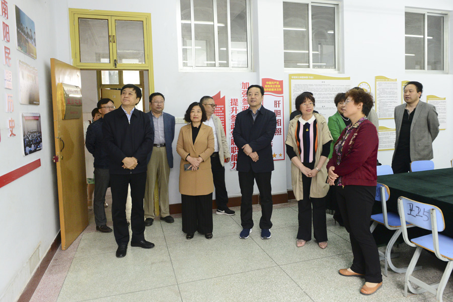 本网讯(文/组织部 许海楠)5月7日上午,省委统战部副部长张利芳,省委统战部党派处处长李凯,市委常委、统战部部长刘树华,市委统战部常务副部长刘红跃等一行8人莅临我校调研民主党派建设工作,并考察了民盟南阳市委医专支部“盟员之家”。校党委书记全新明、副书记逵应坤陪同。(编审/杨金运 摄影/宣传部)