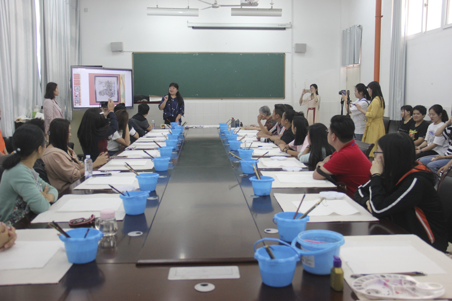 5月20日下午,我校合作院校交流师生在4号教学楼408教室学习体验国画艺术。临床医学系仵湘君老师讲授并现场示范,刘佰蕾老师担任翻译。仵老师结合国画作品简要介绍了国画的类型,讲解了羊毫笔用笔技巧。随后,现场创作国画牡丹并教授如何进行绘画。绘画过程中,仵老师依次进行指导。(编审/李峰松 摄影/国际教育学院)