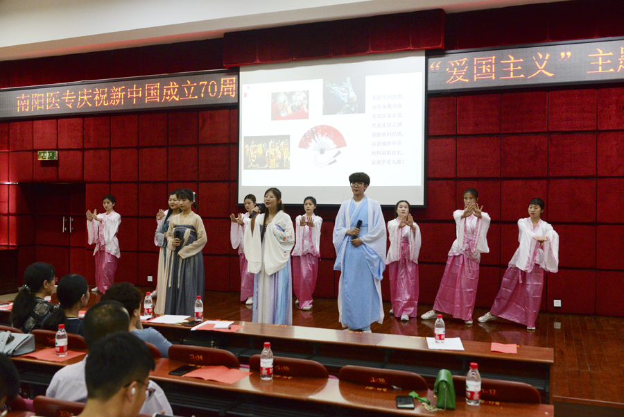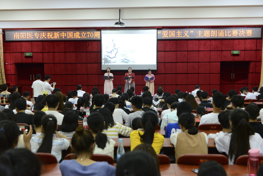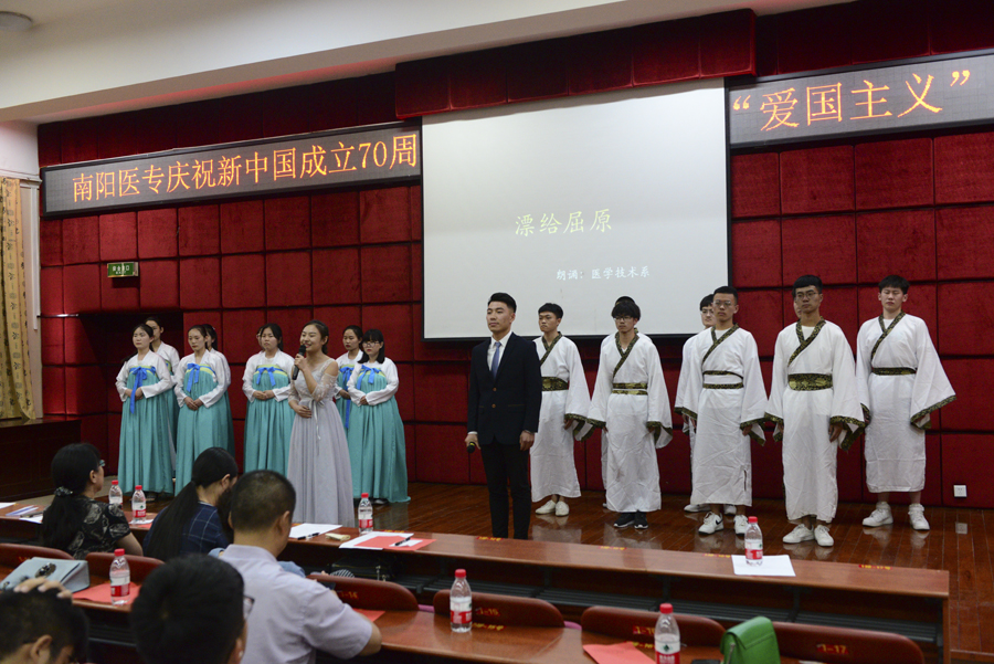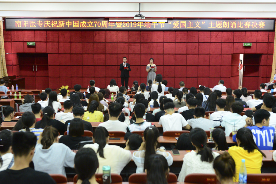 本网讯(文/临床医学系 王静)为深入贯彻落实党的十九大和全国、全省教育大会精神,传承中华优秀传统文化,大力弘扬以爱国主义为核心的民族精神,引导广大师生树立正确的历史观、民族观、文化观,进一步增强文化自信,培养爱国之情,6月4日,我校在图书馆五楼报告厅举办庆祝新中国成立70周年暨2019年端午节“爱国主义”主题朗诵比赛。校党委副书记逵应坤出席活动并致辞;党办副主任王萍、组织部副部长孙超丽、宣传部副部长杨金运、工会女工文体部主任白峰、临床系辅导员刘岩担任比赛评委;各系部院师生300余人观看了比赛。
