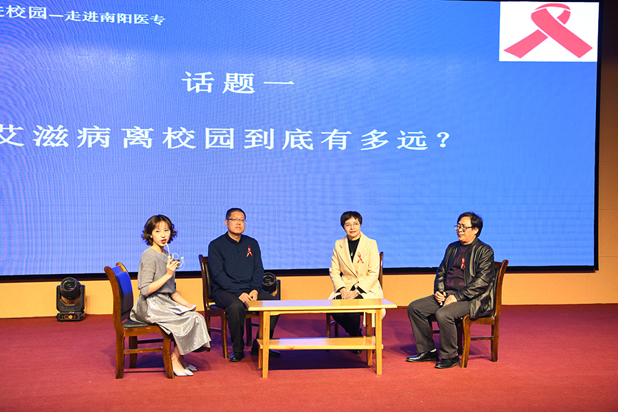 活动在欢快的健美操表演中拉开帷幕。在访谈环节,来自南阳市防艾一线的丁琳、魏顺远、安红波三位专家详细讲解了艾滋病的病因、传播途径、危害、检测、预防措施等七个方面知识,现场还设置了有奖问答活动,师生踊跃参加。刘岩老师一首《爱的奉献》、卫生管理系同学表演的手势舞《堂堂正正一辈子》将现场气氛推向高潮。最后,活动在志愿抗击艾滋病的庄严宣誓声中圆满结束。