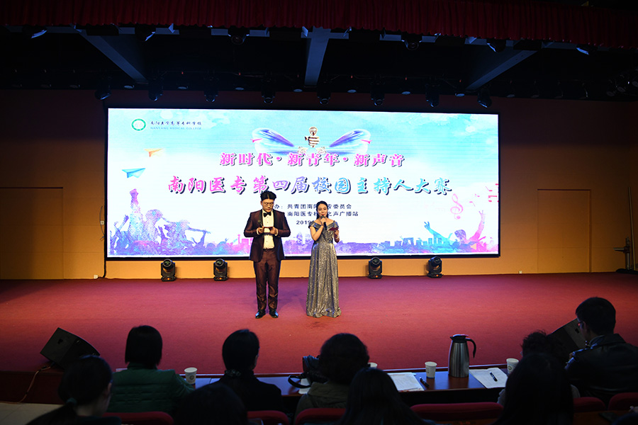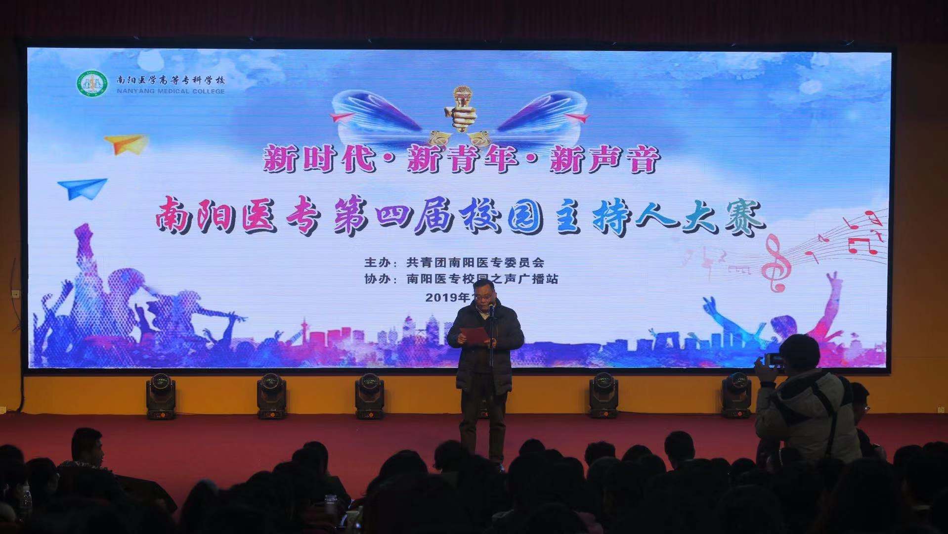本网讯(文/校团委 古婵婵)12月11号下午,由校团委主办、校广播站协办的“新时代,新青年,新声音”南阳医专第四届校园主持人大赛决赛在仲景东区学术报告厅隆重举行。校党委副书记逵应坤、校党委办公室主任杜晓平、总务处处长刘洋、校团委书记徐晓杰出席,党委办公室副主任王萍、党委组织部副部长孙超丽、工会女工部部长白峰、公共教学部副主任夏曼、对外交流合作处综合科科长周国军担任本次大赛评委,各涉学系(部、院)团总支书记、学生代表300余人观看了比赛。