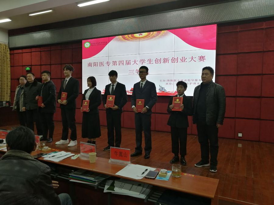 本网讯(文/学生处 张辉)12月19日晚,由学校就业中心主办、护理系承办的第四届大学生创新创业大赛在主校区图书馆五楼学术报告厅圆满落下帷幕。校党委委员、副校长郭万周出席比赛并致辞,系院领导、辅导员、项目指导老师、150余名学生观众观摩了比赛。十个参赛团队参加了此次比赛。河南省首批大学生就业指导名师、南阳师范学院教授张炳兰,河南工业职业技术学院招生就业处处长胡雪梅,南阳农业职业学院招生就处处长金元泽,南阳理工学院招生就业处副处长丁伟,我校设备处处长韩匀亭、保卫处处长牛嵩山、教务处副处长王海鑫担任决赛评委。