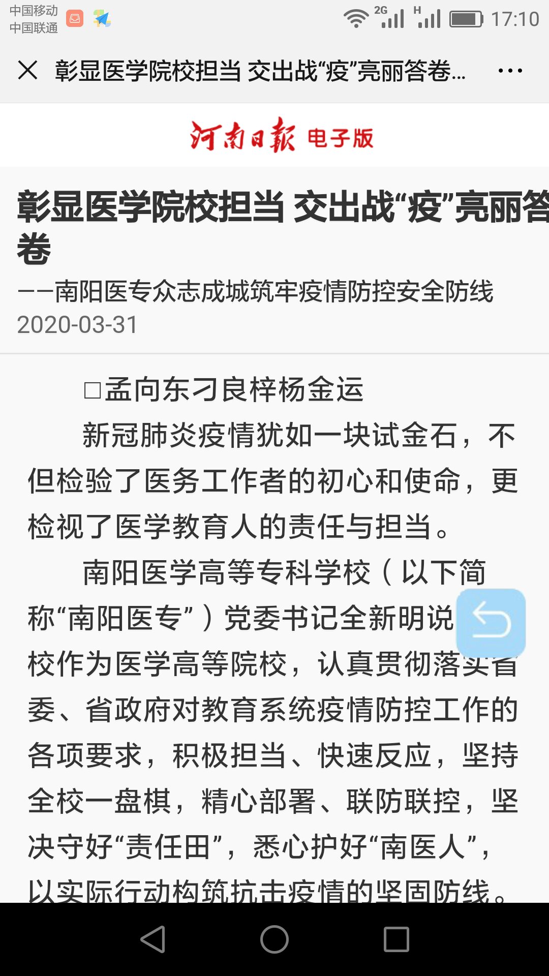 (稿件来源 南阳日报)新冠肺炎疫情犹如一块试金石,不但检验了医务工作者的初心和使命,更检视了医学教育人的责任与担当。