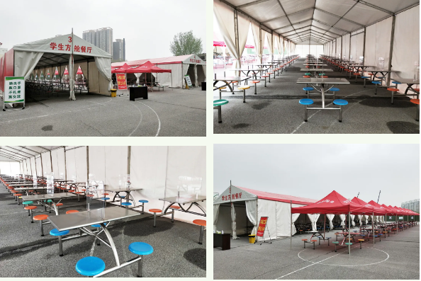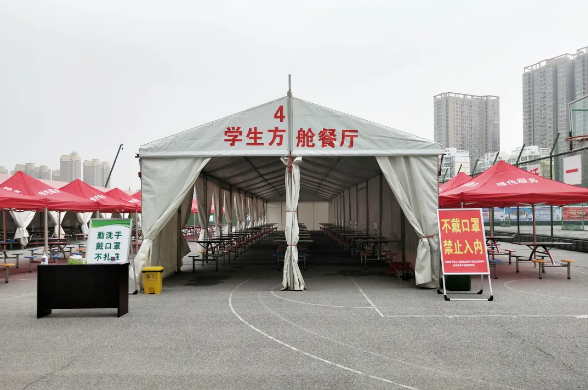 除此之外,南阳医专在仲景东、西校区和孔明校区搭建6个“方舱餐厅”,最多可同时容纳6000人就餐,学校此举被赞“硬核防疫”。该校办公室主任江学法介绍,为防止交叉感染,学校在升级扩建原有餐厅的基础上,搭建了“方舱餐厅”,餐厅桌距、就餐人数都有严格限制,学校还采购了一次性餐具,不向学生加价,将极大方便学生开学后错峰有序就餐。