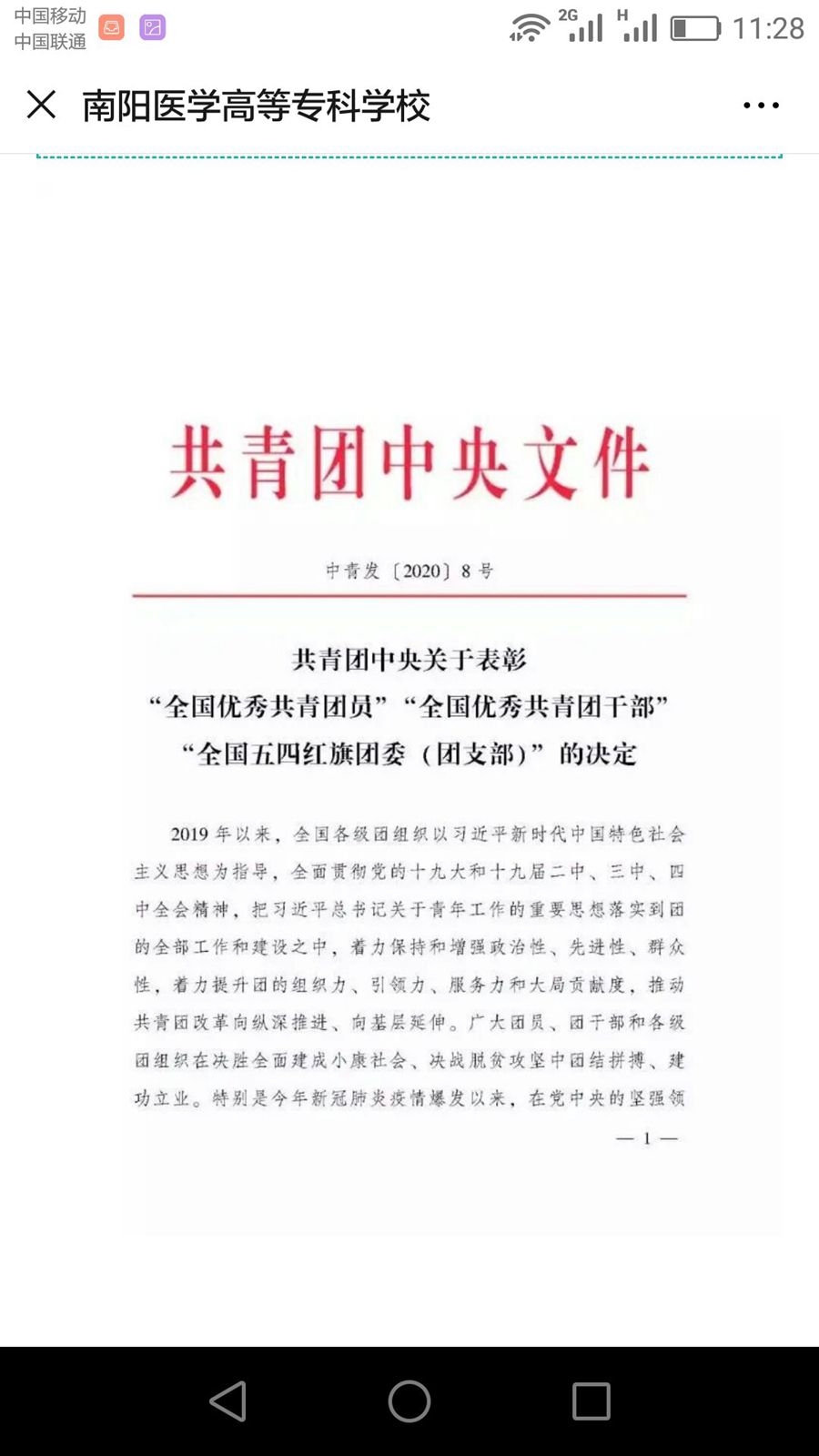 本网讯(文/校团委 马黎莉)五四青年节前夕,共青团中央下发了《共青团中央关于表彰“全国优秀共青团员”“全国优秀共青团干部”“全国五四红旗团委(团支部)的决定”》(中青发[2020]8号)。我校国际教育学院2017级护理专业学生梁祥祥,在中国人民解放军南部战区总医院实习期间,突遇新型冠状病毒肺炎疫情爆发,他放弃春节假期,主动请缨到发热门诊一线参与疫情防控工作,由于表现优秀,被共青团中央评为“全国优秀共青团员”——全国共青团员的最高荣誉,这是我校共青团员首次获此殊荣。2020年5月6日《南阳日报》以《绽放青春风采 彰显责任担当——记“全国优秀共青团员”南阳医专学生梁祥祥》为题刊登了梁祥祥的感人事迹。