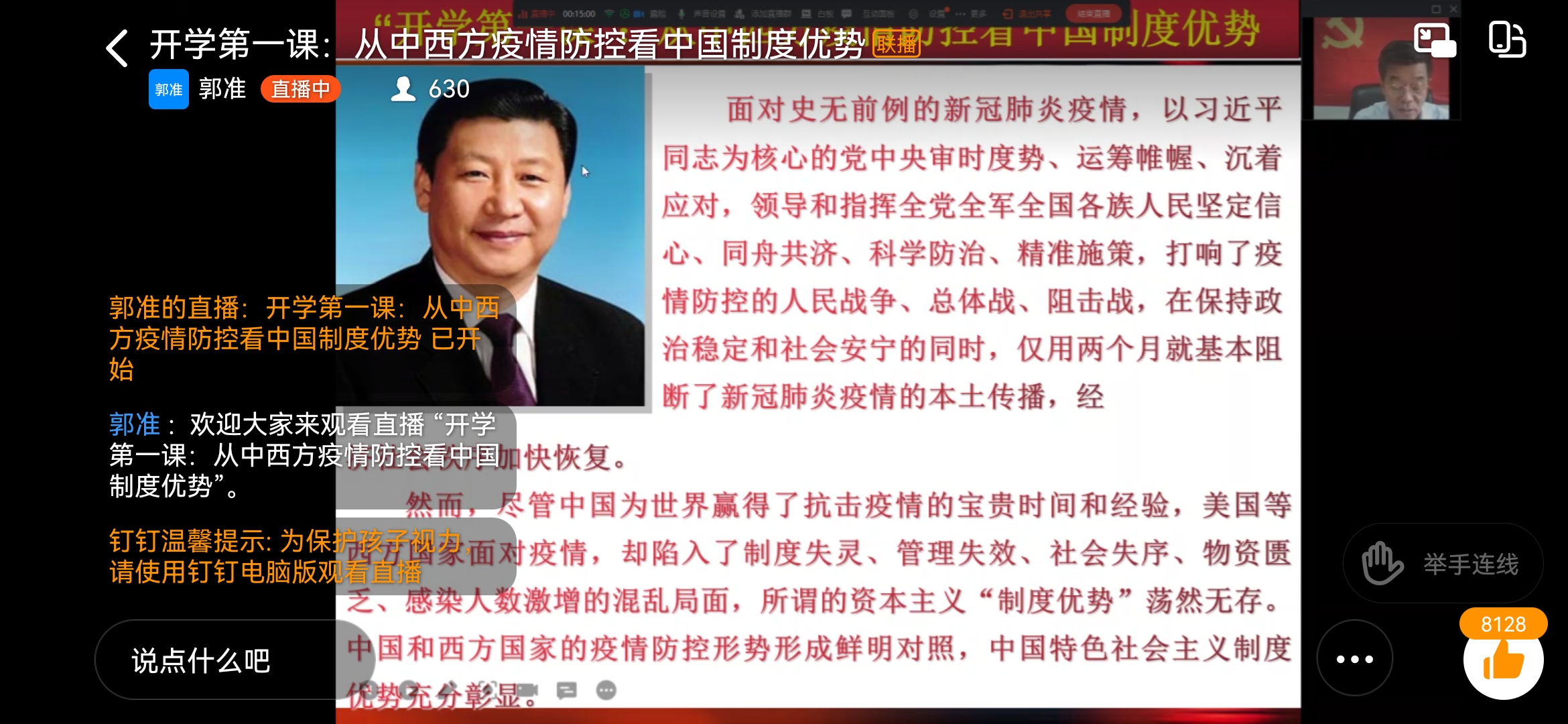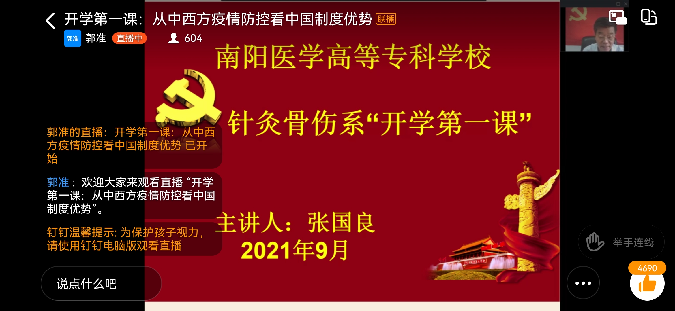 本网讯(文/针灸骨伤系 李明哲91日下午,副校长张国良仲景东区针灸骨伤系办公室以“从中西方疫情防控看中国制度优势”为主题作“开学第一课”专题思政讲座。本次授课采用钉钉直播方式进行。针灸骨伤系全体教职工、2020级学生约700人参加学习