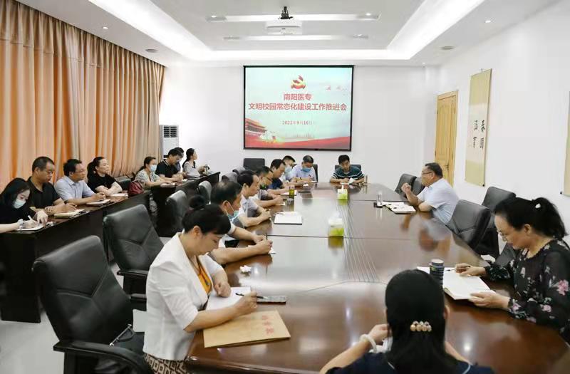 本网讯(文/宣传部 陈铁良)9月16日上午,我校在仲景西区1号办公楼三楼会议室召开文明校园常态化建设工作推进会。党委副书记逵应坤主持会议并讲话。