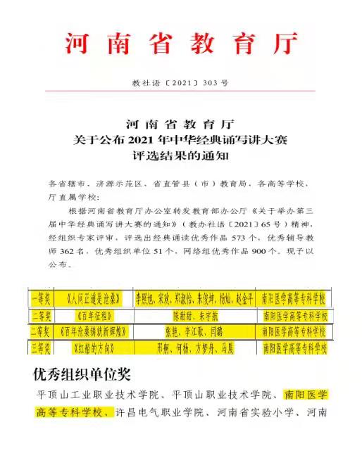 本网讯(文/公教部  李朝近日,省教育厅、市总工会分别公布了中华经典诵写讲大赛的结果,学校均获得优秀组织奖;公教部张艳、李江歌、闫璐三位老师的作品分别获得省、市二等奖;在省教育厅组织的评选中,中医系李照旭、宋欢、郑淑怡等六位同学的作品获得一等奖,中医系邢舸、何杨、方梦舟、马晨四位老师的作品获得三等奖。