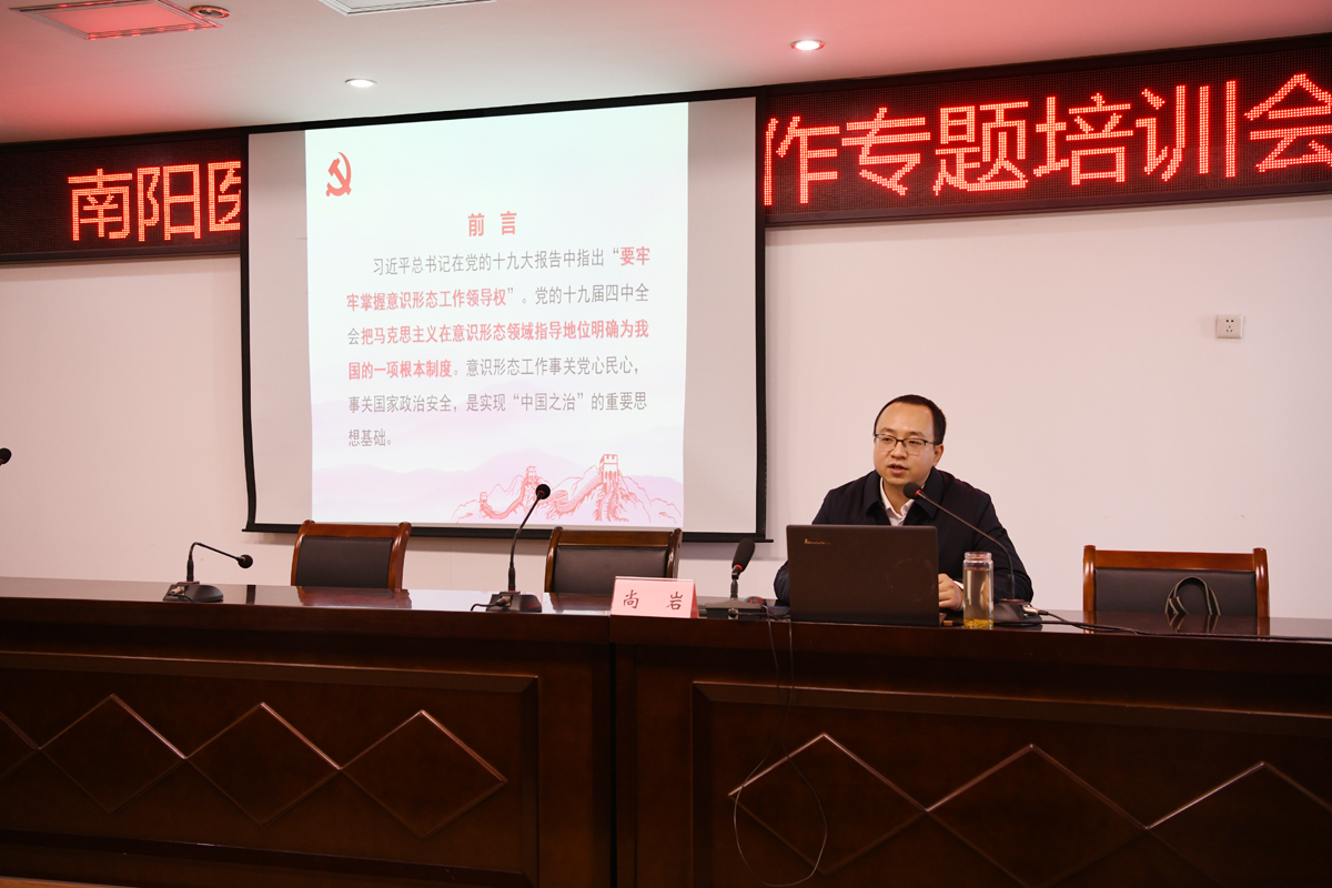 本网讯(文/宣传部 张旭斌)11月8日下午,我校在一号行政楼五楼会议室召开意识形态工作专题培训会。学校特邀市委党校尚岩老师主讲。学校中层正职、主持工作副职,学工办主任,学管党支部书记,思政课专兼职教师参加培训学习。培训会由党委副书记逵应坤主持。
