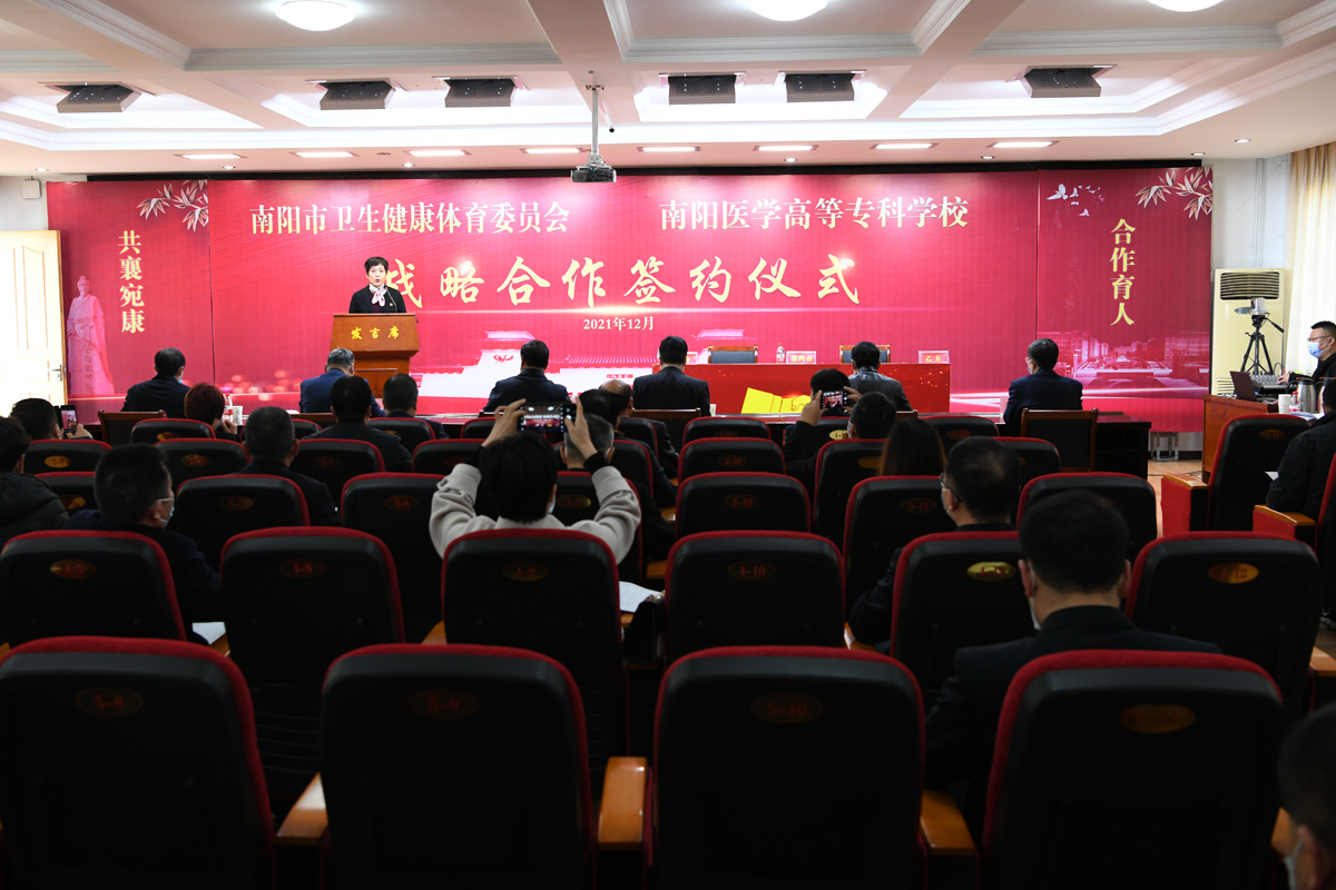 本网讯(文/教务处 张峰)2021年12月2日上午9时,南阳市卫生健康体育委员会与VK电竞(中国),亚洲电竞先驱战略合作签约仪式在VK电竞(中国),亚洲电竞先驱1号行政楼五楼会议室举行。南阳市卫健体委党组书记、主任高贤信,南阳市卫健体委党组成员、副主任李志炜,南阳医专党委书记柳明伟,南阳医专党委副书记、校长王立义,以及南阳市宛城区卫健体委、卧龙区卫健体委、南阳市中心医院等医疗卫生单位、各签约医院院长、南阳市卫健体委相关职能部门负责人、南阳医专领导班子成员、相关部门负责人等出席签约仪式。签约仪式由南阳医专党委委员、副校长范真主持。