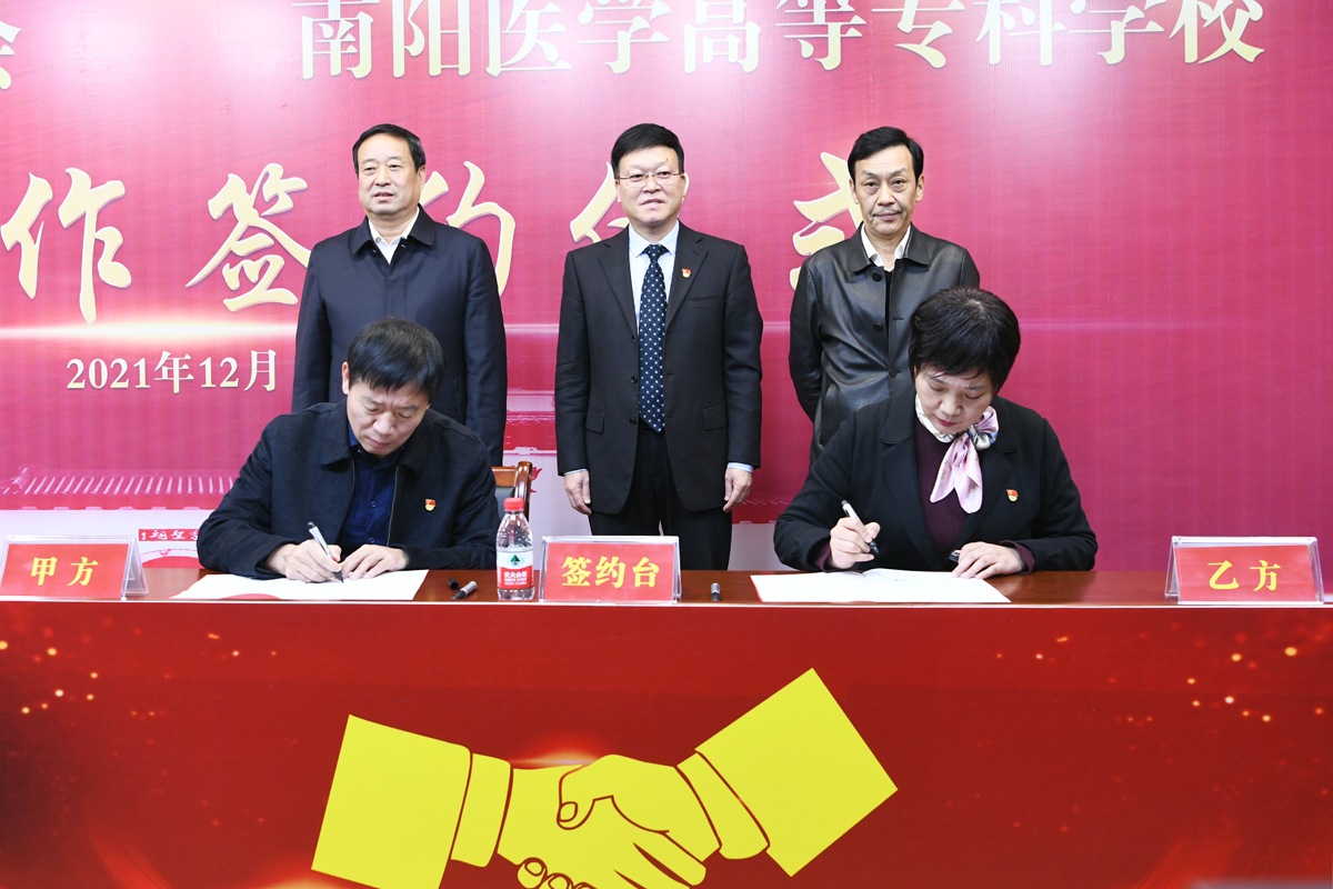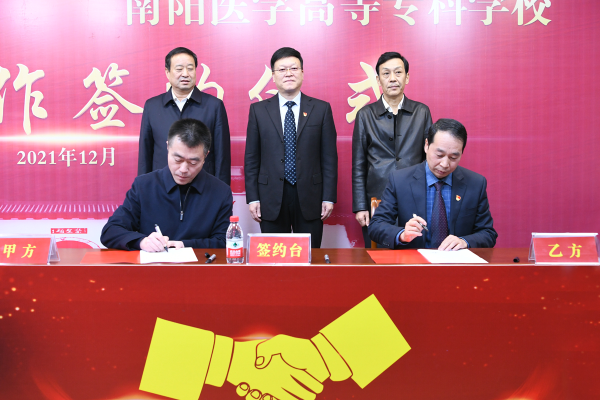 受王立义委托,范真代表南阳医专与南阳市卫健体委副主任李志炜签订《校地战略合作协议》;南阳医专教务处处长刘荣志代表南阳医专与南阳市第四人民医院院长孟小波、南阳市口腔医院院长刘中寅、南阳市康复医院(南阳市第九人民医院)院长刘建、南阳市骨科医院院长杜春生、南阳市眼科医院院长马玉红分别签署了《校院战略合作协议》。高贤信、柳明伟、王立义鉴签。