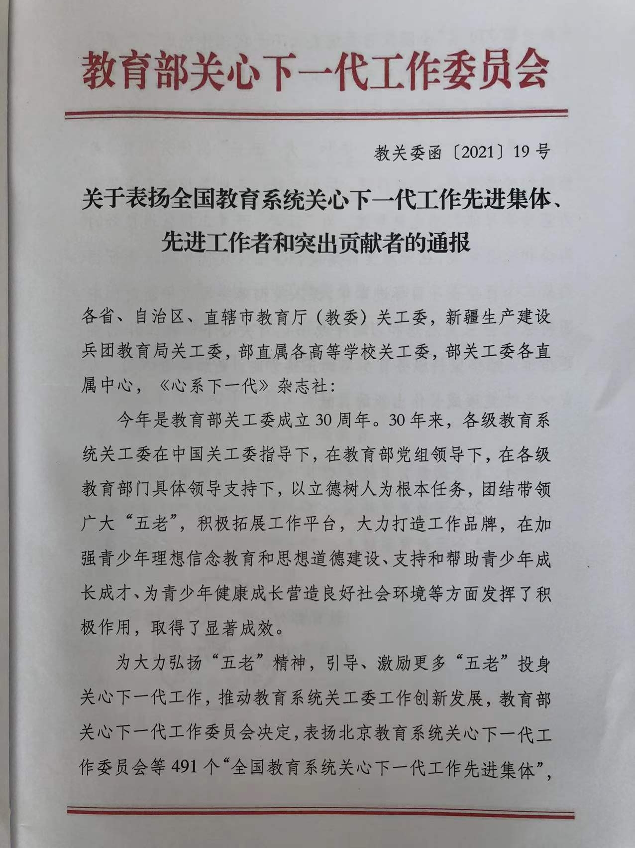 本网讯(文/离退处 朱迪)12月22日,教育部关心下一代工作委员会发布《关于表扬全国教育系统关心下一代工作先进集体、先进工作者和突出贡献者的通报》(教关委函[2021]19号),VK电竞(中国),亚洲电竞先驱关心下一代工作委员会被评为全国教育系统关心下一代工作先进集体。我校是河南省高职高专类院校中唯一获选院校。