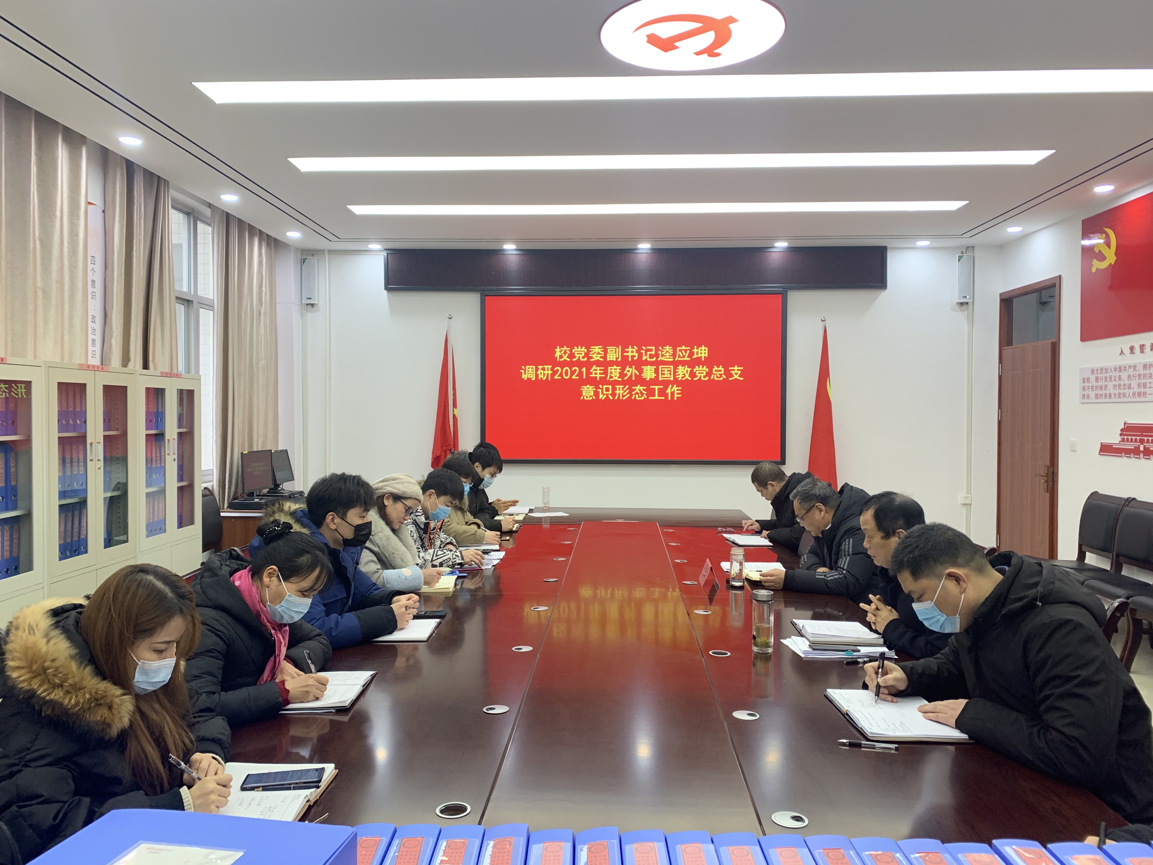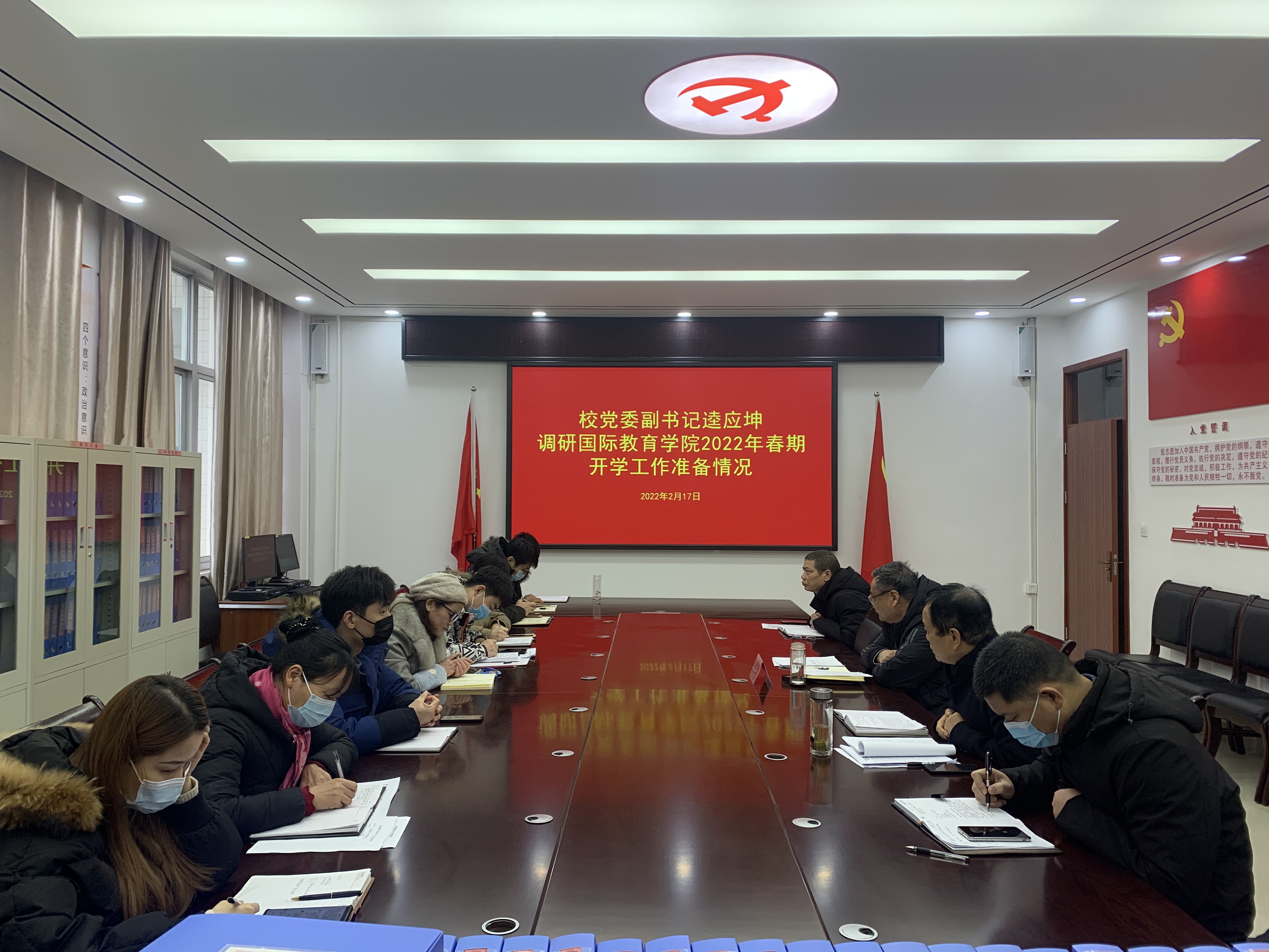 本网讯(文/国际教育学院 李斐)2月17日上午,校党委副书记逵应坤深入我院就2021年度意识形态工作及2022年春期开学工作准备情况进行调研。外事国教党总支全体人员参加此次调研会。