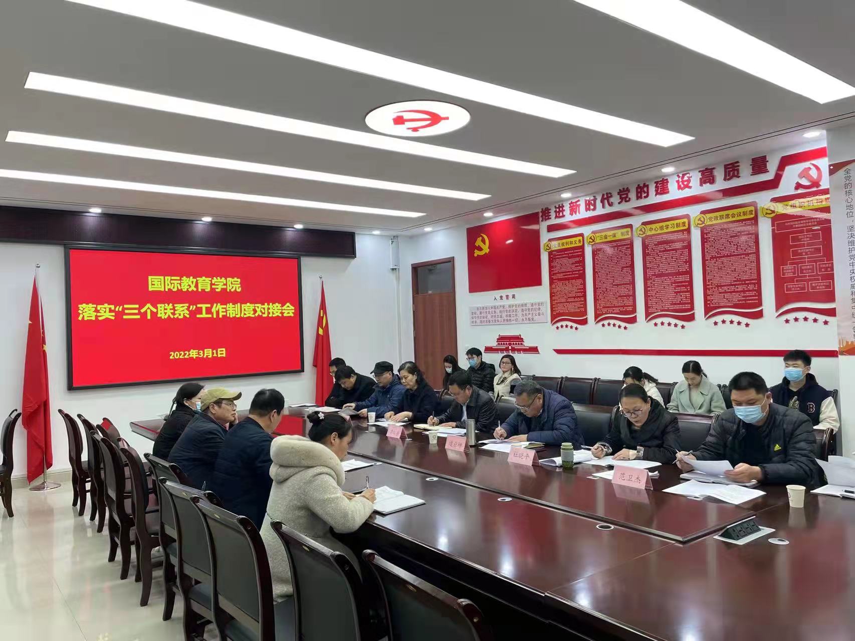 本网讯(文/国际教育学院  李斐)为贯彻落实在全校党政机关领导干部中建立为师生办实事“三个联系”工作制度,推动党史学习教育取得新成效。3月1日下午,校党委副书记逵应坤带领第三工作组领导干部深入国际教育学院就落实“三个联系”工作制度进行对接。外事国教党总支书记卢朝彬主持会议,学院全体辅导员、班主任参加会议。