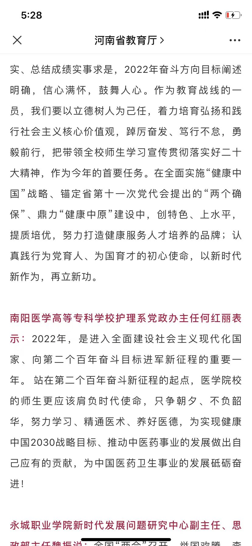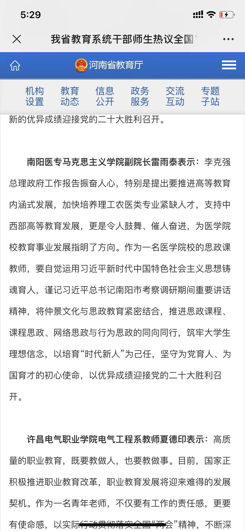 本网讯(文/宣传部 程安琪)2022年全国“两会”期间,我校师生通过多种方式积极收听收看相关报道并发表了热烈感想。3月5日、3月8日,河南省教育厅在其公众号中两次报道我校干部师生热议全国“两会”胜利召开及全国“两会”教育问题。