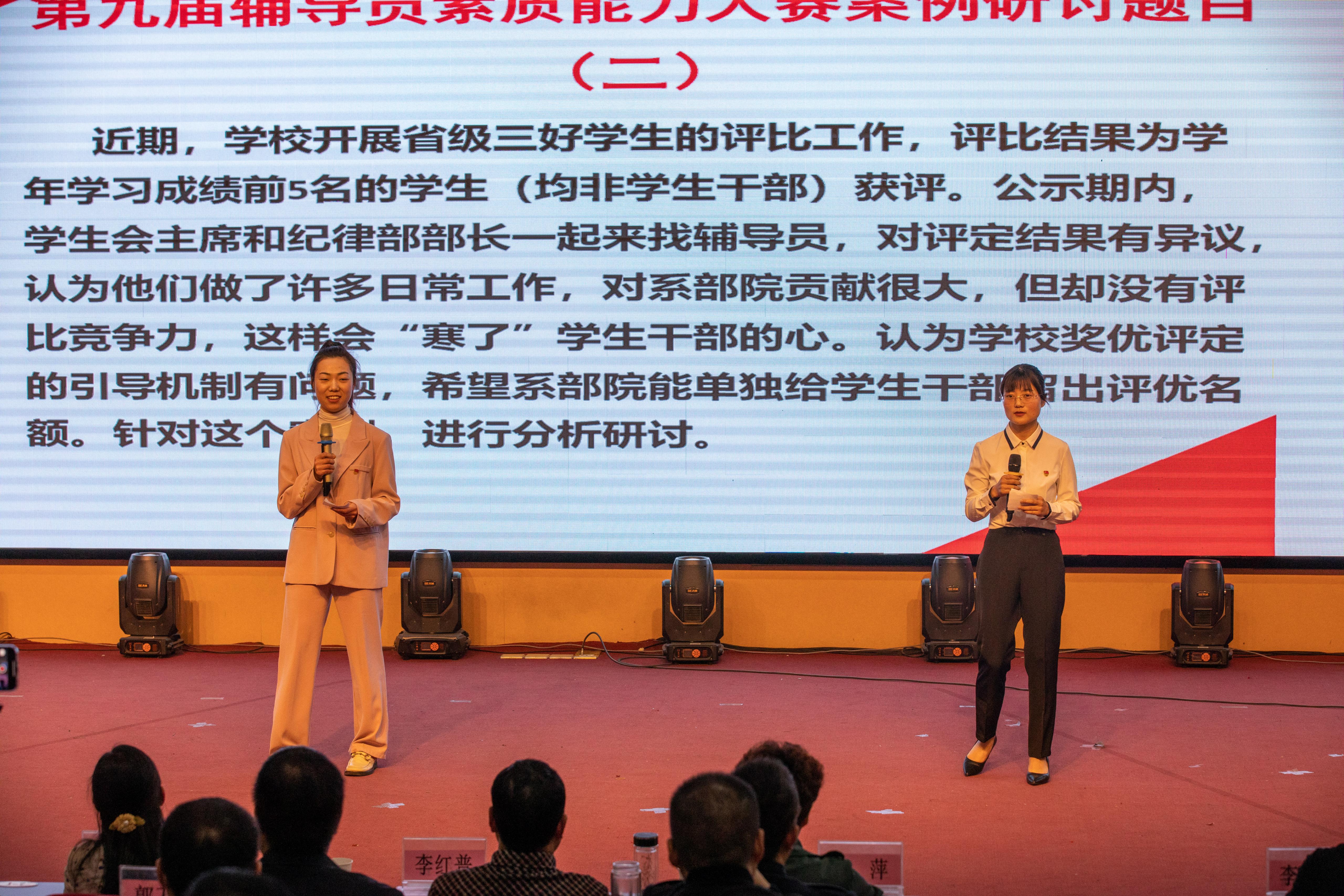 本网讯(文/学生处 皇甫乐观)3月11日,我校在仲景东区天景苑报告厅隆重举行第九届辅导员素质能力大赛决赛。校党委委员、副校长郭万周出席本次大赛并致辞,他对我校辅导员工作给予了充分肯定,我校辅导员队伍是一支能战斗、能吃苦、能奉献的队伍。组织部、宣传部、工会、团委、档案中心、公共教学部及学工部相关负责人担任评委,各系(院)领导,全体辅导员,学生代表现场观摩了大赛。