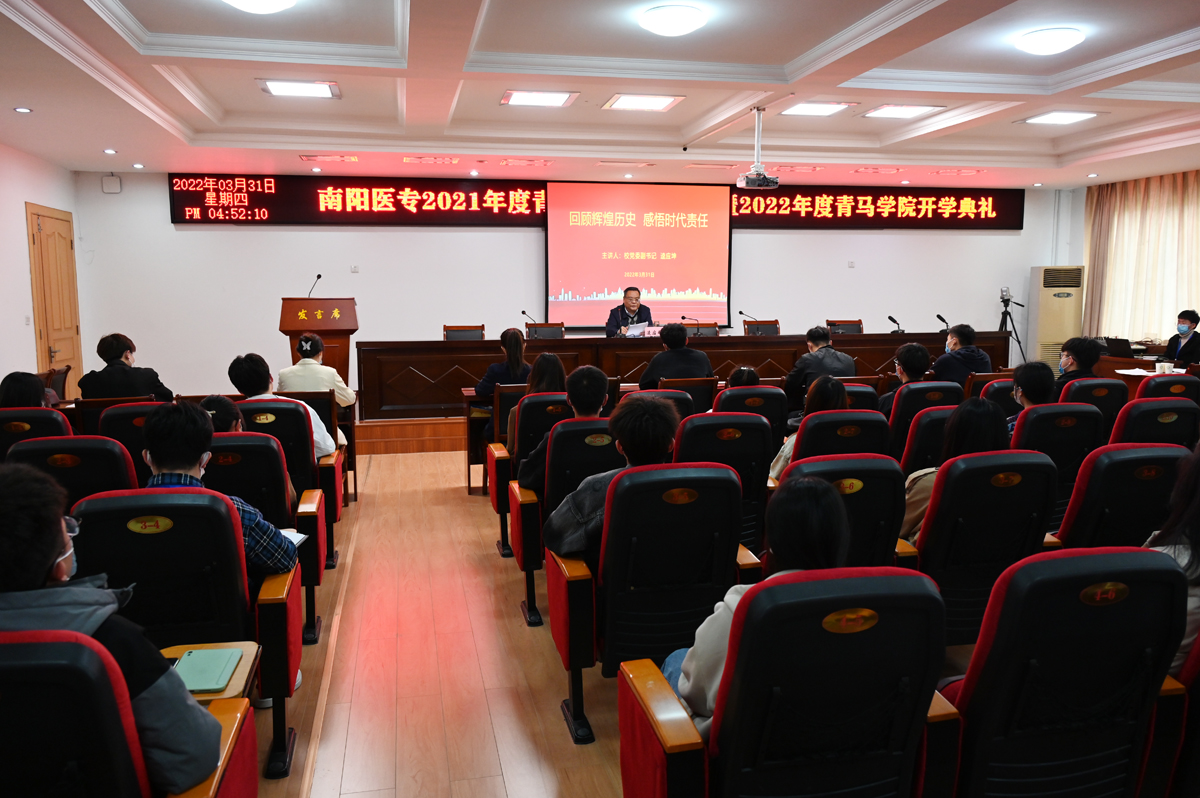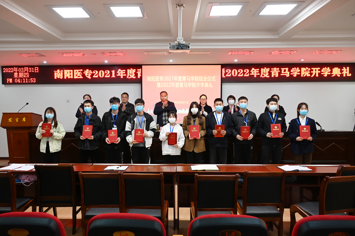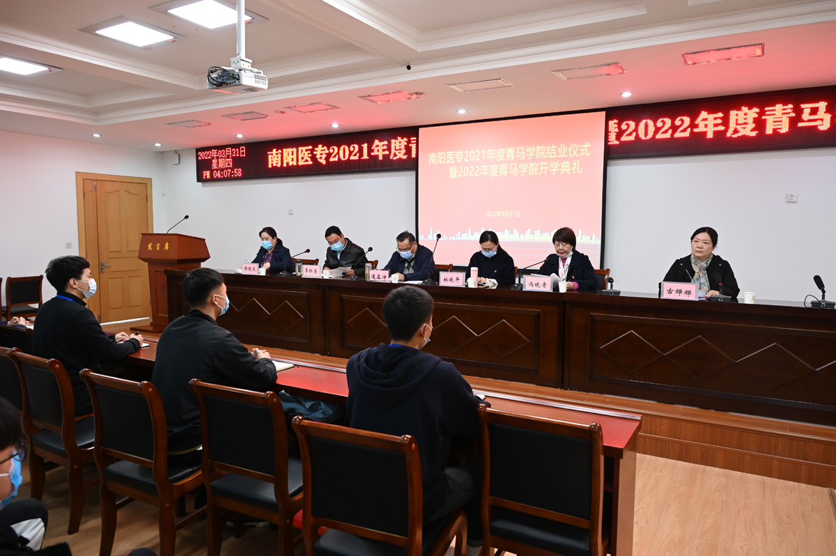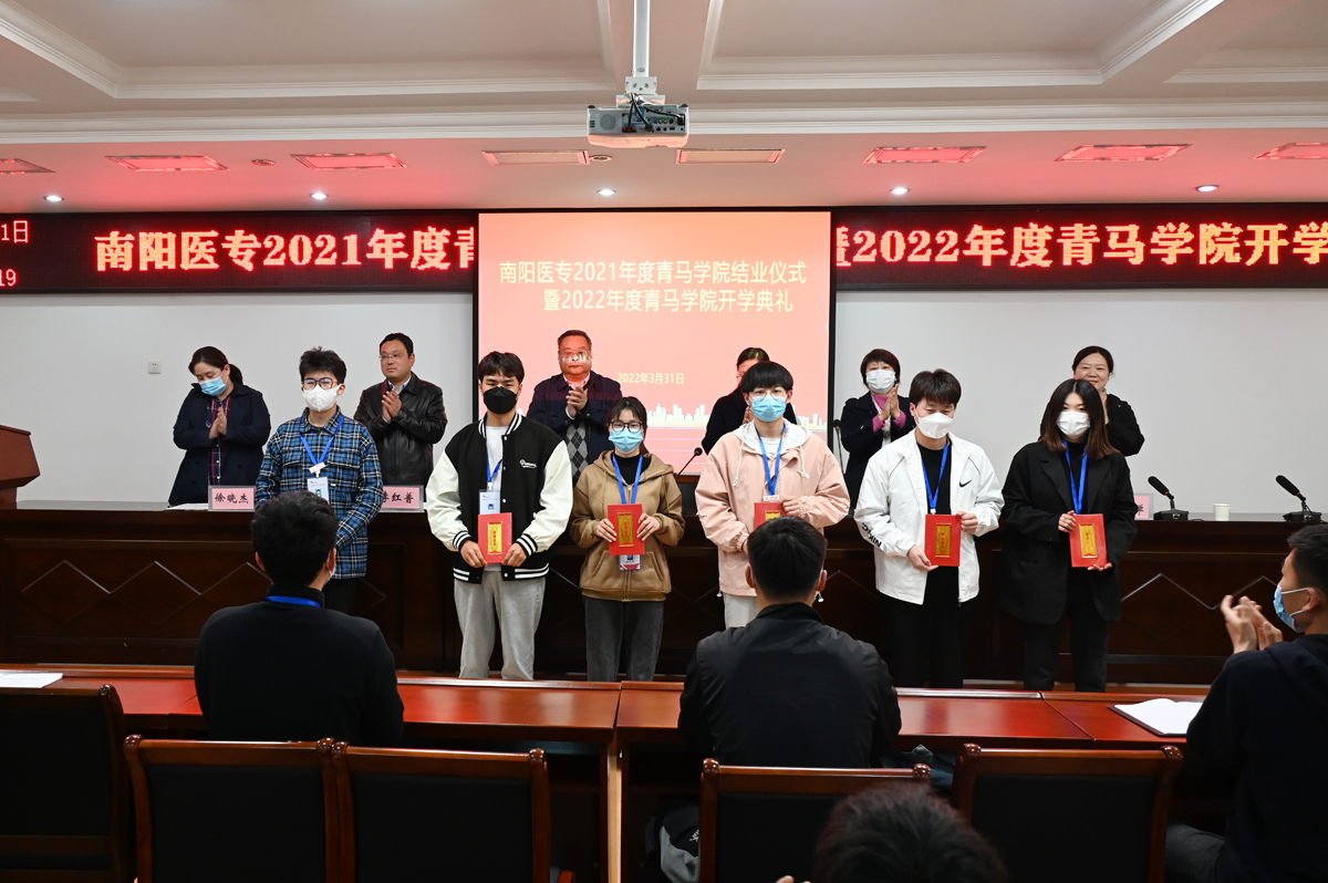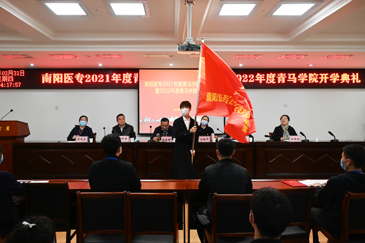 会议上冯晓青、李红普、杜晓平分别宣读了《关于准予南阳医专2021年度青马学院学员结业的决定》《关于南阳医专2021年度青马学院优秀学员的表彰决定》《关于举办南阳医专2022年度青马学院的通知》三个文件。出席会议的领导为2021年度青马学院代表、优秀学员代表颁奖,校党委副书记逵应坤为2022年度青马学院授旗。