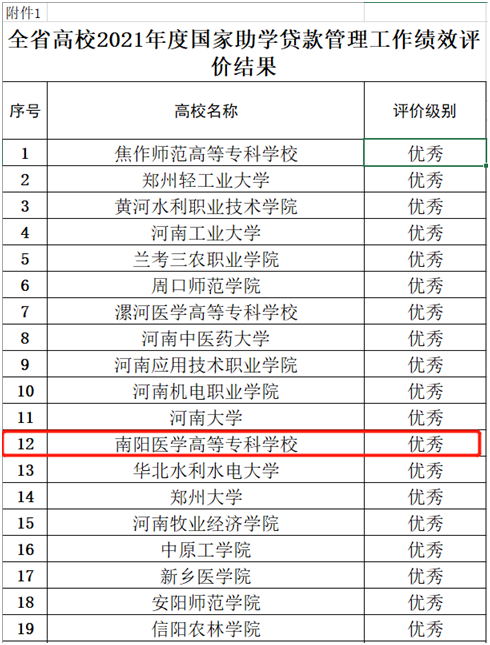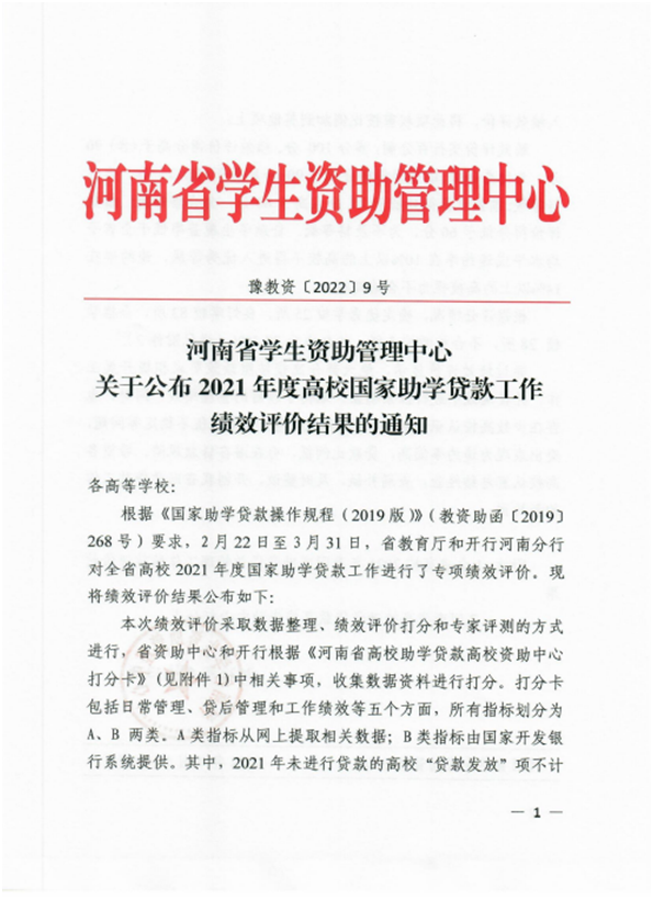 本网讯(文/学生处  吴东波)2月22日至3月31日,河南省教育厅和国家开发银行河南省分行对全省139所高校2021年度国家助学贷款工作进行了专项绩效评价。此次绩效评价采取数据整理、绩效评价打分和专家评测的方式进行,省资助中心和开行根据《河南省高校助学贷款高校资助中心打分卡》中相关事项,收集数据资料进行打分,包括日常管理、贷后管理和工作绩效等五个方面。最终从139所高校中评定出优秀学校25所, 我校以优异成绩被评为优秀单位。