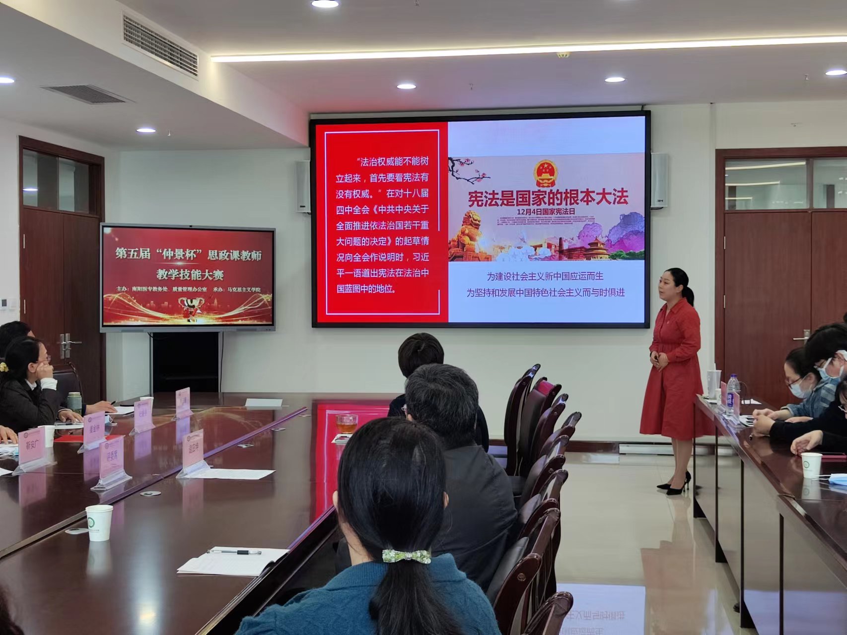 本网讯(文/马克思主义学院  卢孟)为深入学习贯彻习近平总书记在学校思想政治理论课教师座谈会上的重要讲话精神和“大思政课”重要指示精神,按照《关于开展全省学校思想政治理论课教学技能“大练兵、大比武、大展示”活动的实施意见》(豫高发〔2021〕141号)的要求,2022年4月20日下午,由教务处、质量管理办公室主办,马克思主义学院承办的南阳医专第五届“仲景杯”思政课教师教学技能大赛决赛在仲景文化中心隆重举行,校党委副书记逵应坤、教务处处长、质量管理办公室主任、党委组织部部长、宣传部部长等领导出席。特聘请南阳师范学院马克思主义学院院长靳安广教授、南阳理工学院马克思主义学院院长姜金林教授等专家担任大赛评委。全校思政课专兼职教师全员参加观摩学习。