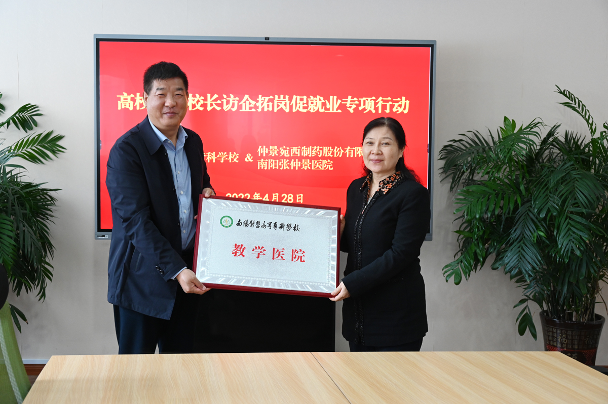 本网讯(文/就业创业处 张辉)4月28日下午,党委书记柳明伟,副校长郭万周及宣传部、教务处、就业创业处负责同志一行赴仲景宛西制药股份有限公司及南阳张仲景医院进行实地走访调研并召开座谈会,扎实开展我校书记校长访企拓岗促就业专项行动。仲景宛西制药股份有限公司董事长孙锋,南阳张仲景医院党委书记、院长韩丽华,以及医院其他领导、相关职能科室负责人参与座谈。