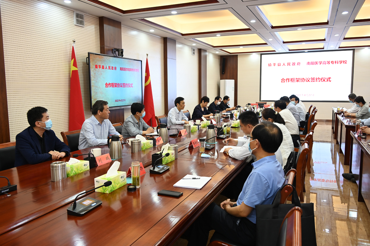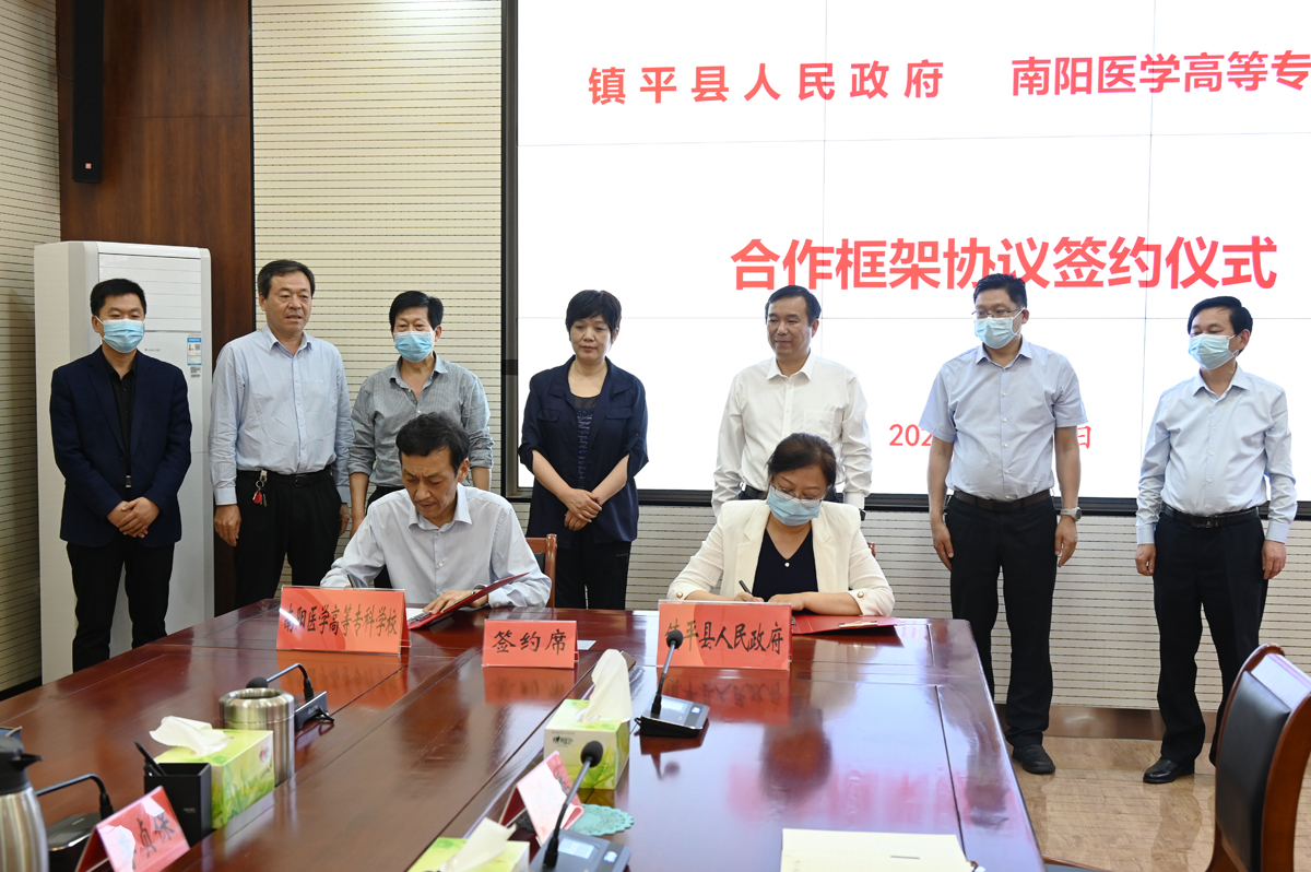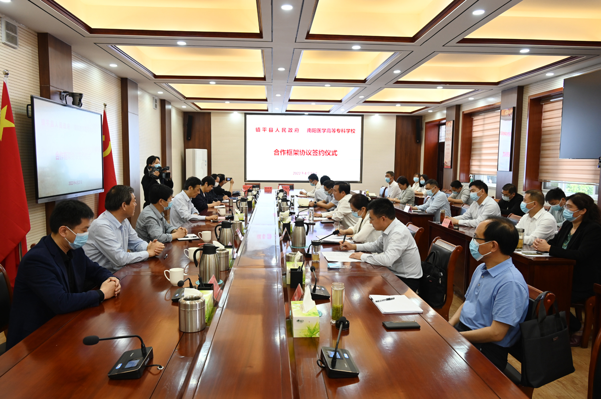 在热烈的气氛中,我校与镇平县人民政府签署了合作框架协议。根据协议,双方将围绕定向医学专业学生培养、设立培训基地、基层卫生人员能力提升培训等方面建立长期稳定的校地合作关系,依托双方人才、科研、技术、资源、产业等优势,深入开展医教研协同发展合作交流,共建临床教学与实习平台、人才引进平台、培训教育平台、科研创新平台、锻炼实践平台,合力打造协同发展共同体。
