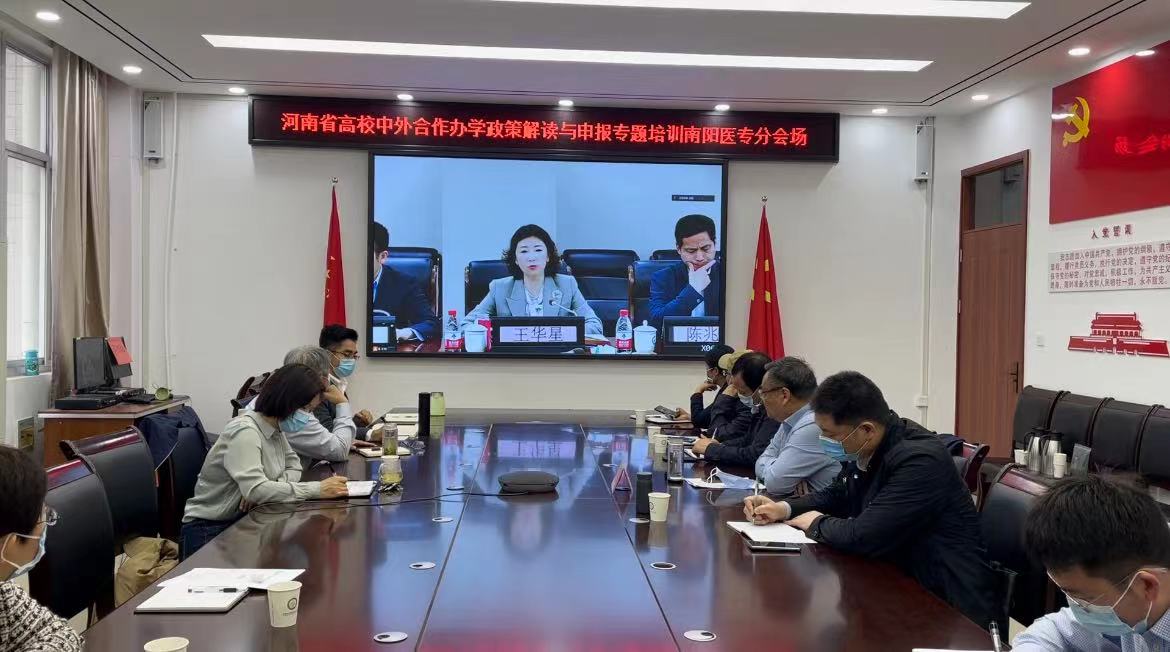 本网讯(文/对外交流合作处 夏灵果)4月28日,河南省高校中外合作办学政策解读与申报专题培训通过“腾讯会议”举办,会议由省教育厅对外合作与交流处处长、河南省教育国际交流协会秘书长王华星主持,南阳医专分会场设在3号教学楼423会议室,党委副书记逵应坤出席,对外交流合作处、国际教育学院、质量管理办公室、教务处、计财处、法制办等部门线上参加。