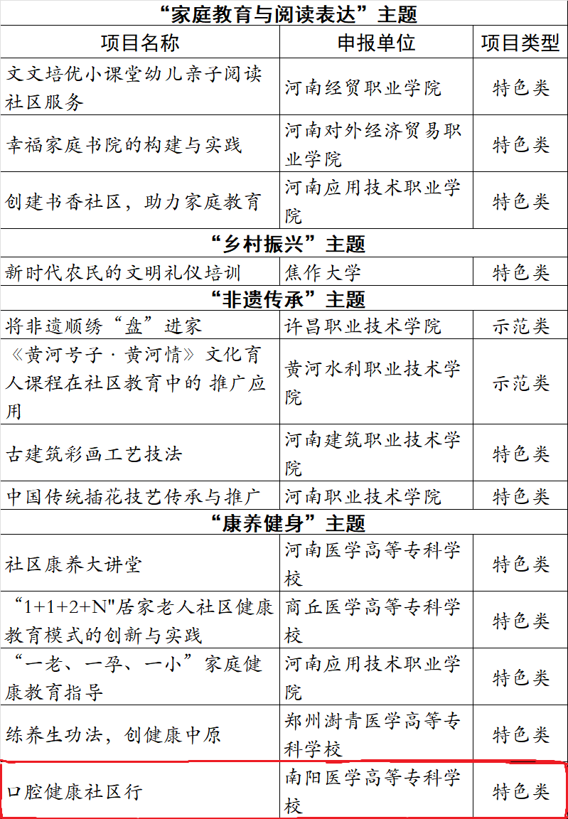 本网讯(文/口腔医学系  张岳)近日,教育部职业教育与成人教育司公布了社区教育“能者为师”实践创新项目首批启动名单,确定了首批启动的社区教育“能者为师”实践创新项目共403个。我校口腔医学系张岳团队申报的“口腔健康社区行”入选“康养健身”特色类项目,标志着我校社区教育公共服务和普惠水平迈上新台阶。