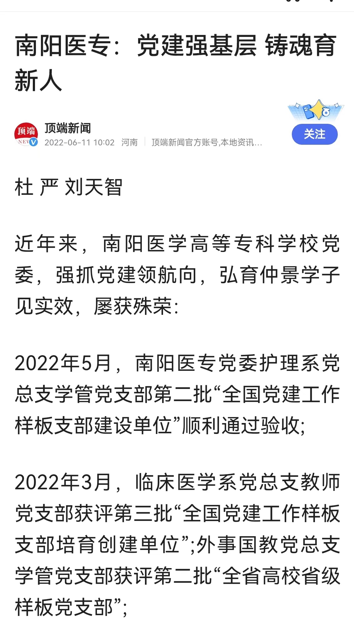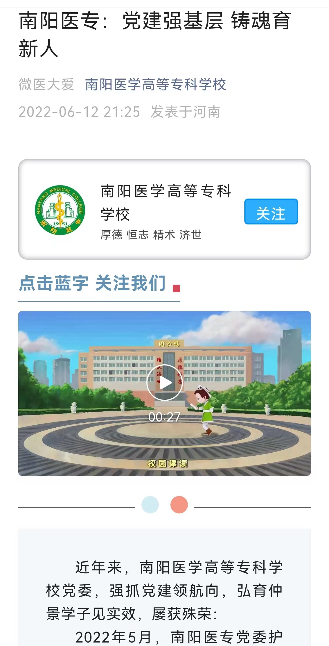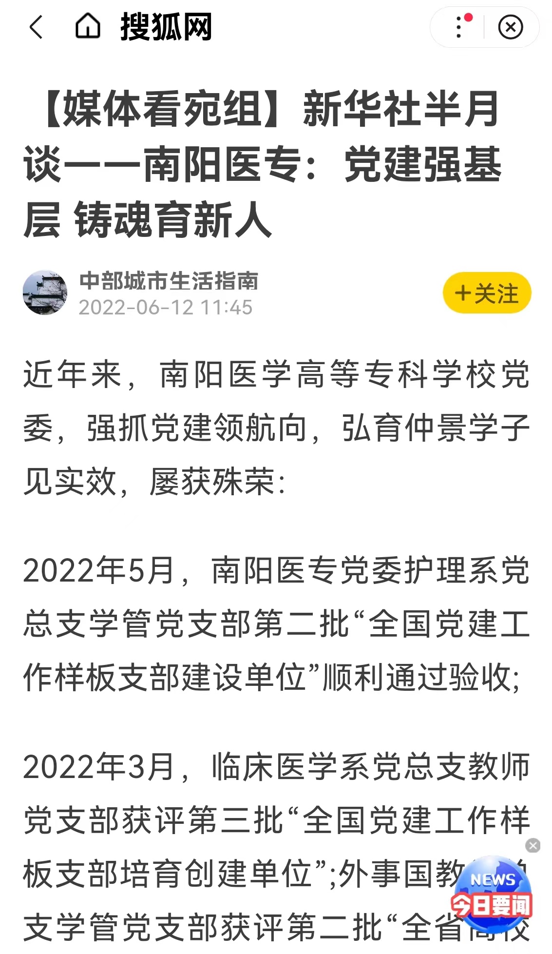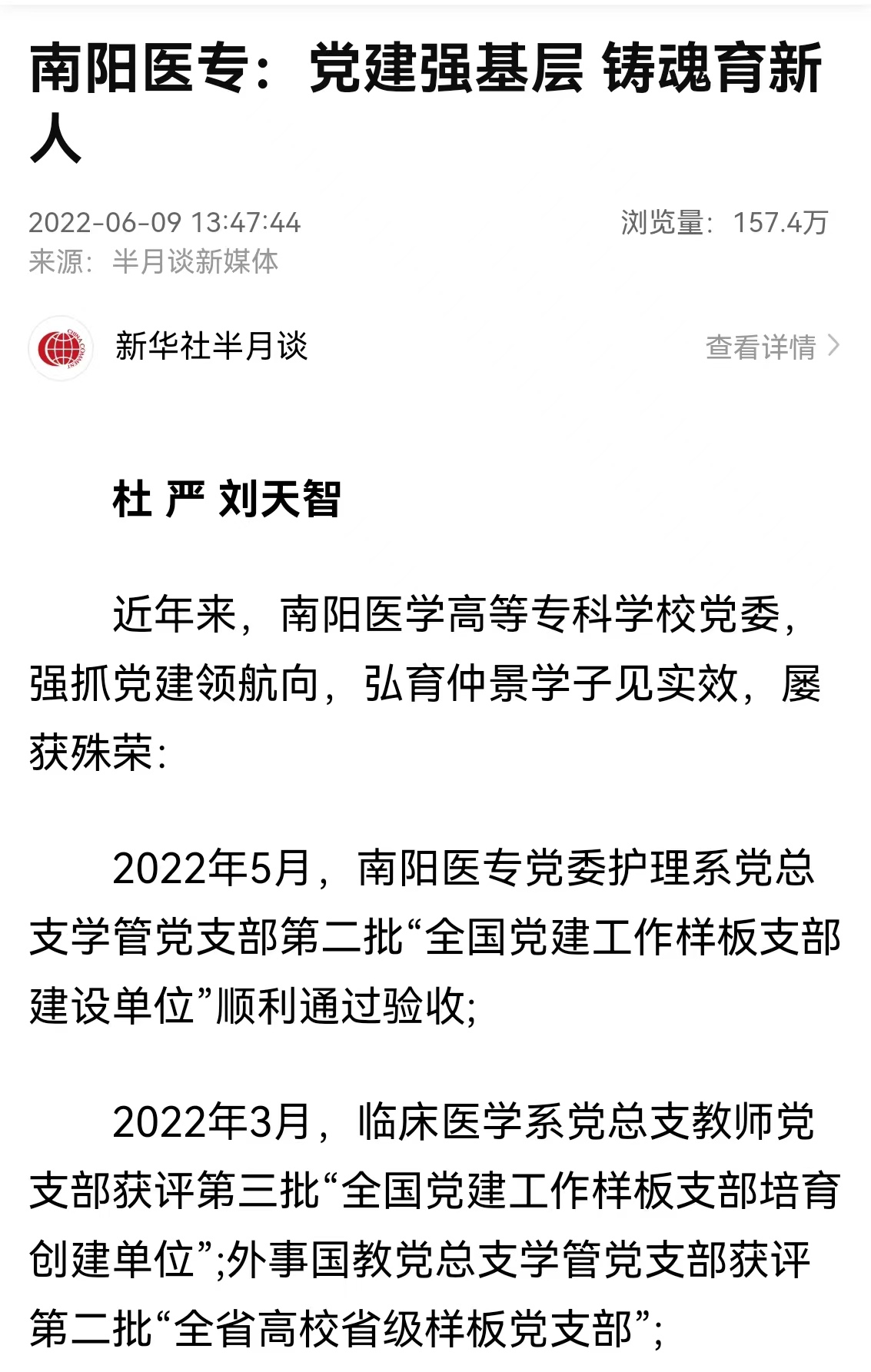 本网讯(文/统战部 李梦华)6月9日,新华社半月谈刊发专题文章《南阳医专:党建强基层 铸魂育新人》,全面报道了我校近年来在党建工作中取得的突出成绩。南阳医专党委始终坚持强抓党建工作,强基固本,实效突出,特色鲜明,屡获全国、全省殊荣。这篇报道在新华社半月谈、新华社客户端等媒体发出后,短短一天时间阅读量即破百万,收到了良好的社会效果,有力地扩大了学校社会声誉。(编审 李红普)