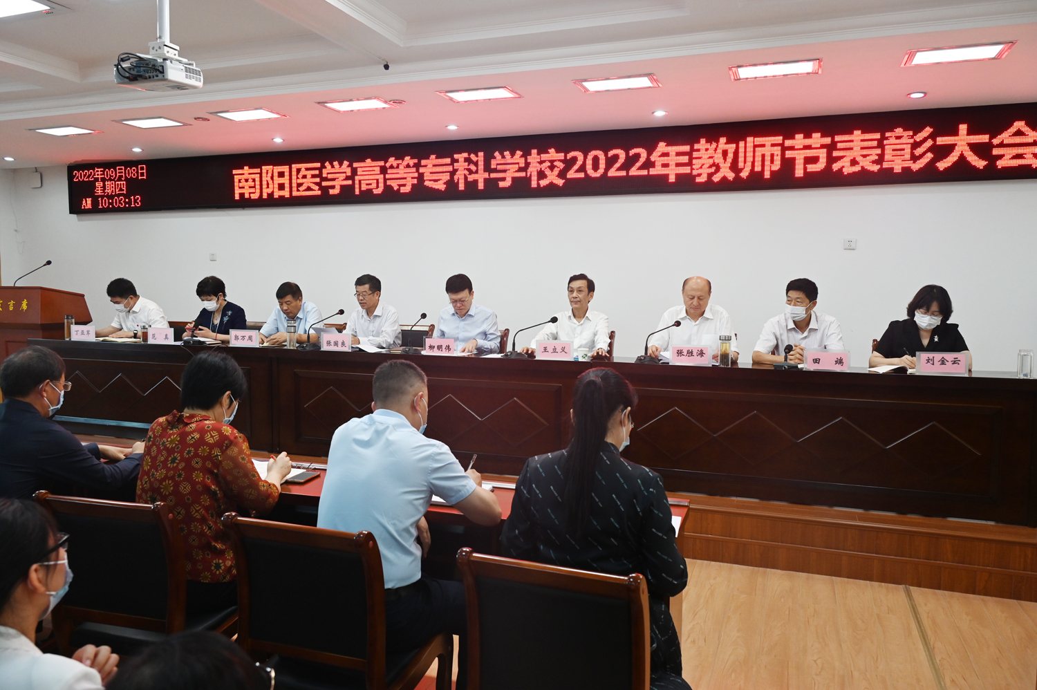 本网讯(文/党政办 毕大鹏)为庆祝第38个教师节,9月8日上午,学校采取线上主会场和线下分会场相结合的形式,举行了2022年教师节表彰大会。大会主会场设在1号办公楼5楼会议室,校领导班子成员,优秀教师、优秀教育工作者代表,以及各处(室)负责同志,各系(部、院)主任参加了会议。分会场设在各系(部、院),参会人员为各系(部、院)书记、全体专兼职教师、全体辅导员。其他党政和后勤教辅部门人员在各自办公室通过手机钉钉群直播自行进行了观看。会议由校长王立义主持。