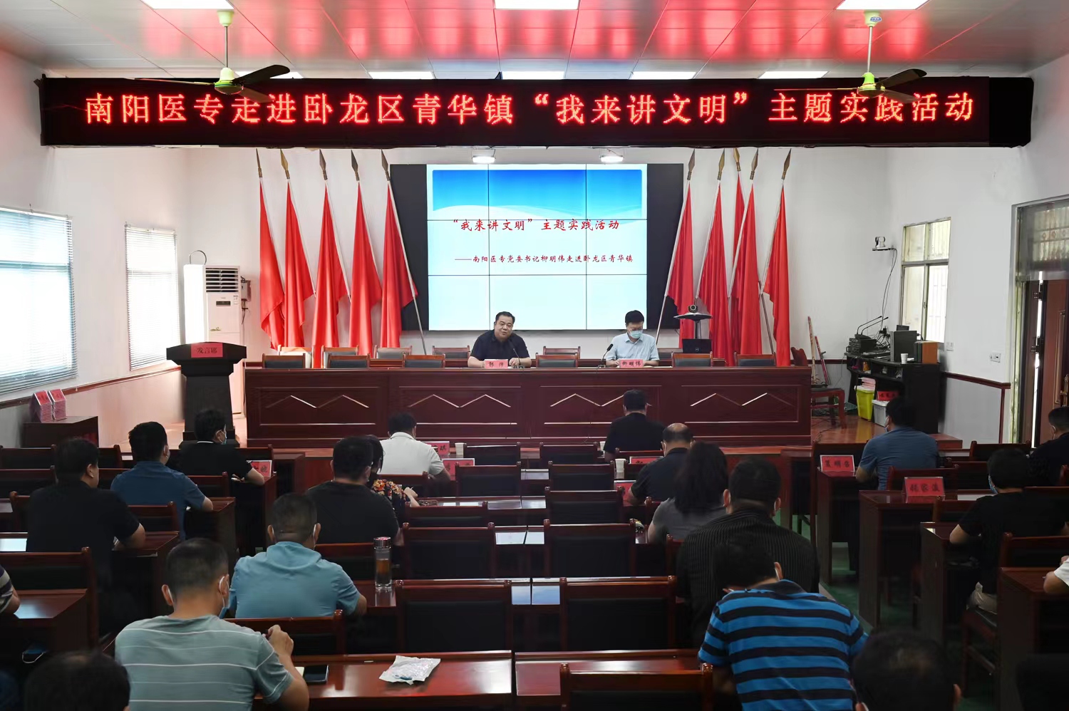 本网讯(文/宣传部 张旭斌)9月15日下午,我校党委书记柳明伟赴卧龙区青华镇开展“我来讲文明”主题实践活动。青华镇镇党政班子成员、干部群众共40多人参加主题讲座。讲座由青华镇党委书记郭沛主持。