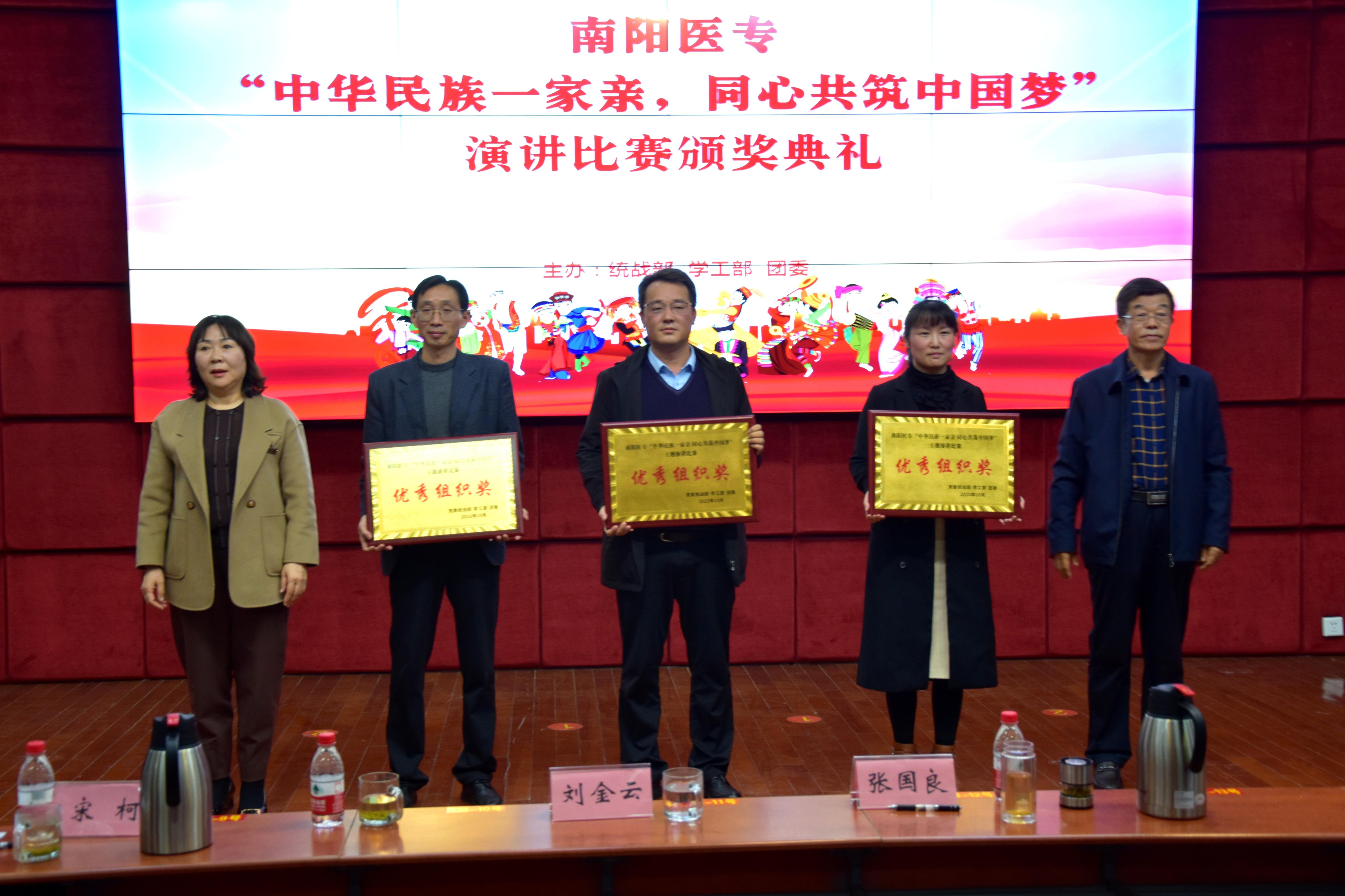 本网讯(文/党委统战部 李梦华)10月11日下午,由校党委统战部、学工部、团委联合举办的南阳医专“中华民族一家亲,同心共筑中国梦” 主题演讲比赛,在图书馆五楼报告厅成功举行。校党委委员、副校长张国良,校党委委员、纪委书记刘金云,南阳师范学院统战部副部长宋柯,南阳理工学院统战部副部长马丹,中国电视艺术家协会会员、南阳市电影电视家协会副主席石磊,卧龙区影视家协会副主席、南阳兄弟传媒总导演、南阳三剑客文化总策划郭峰,卧龙区电影电视家协会理事、南阳兄弟传媒总导演王康,校统战部部长王岩,校学工部部长、学生处处长梁顺平,校团委书记徐晓杰出席演讲比赛。