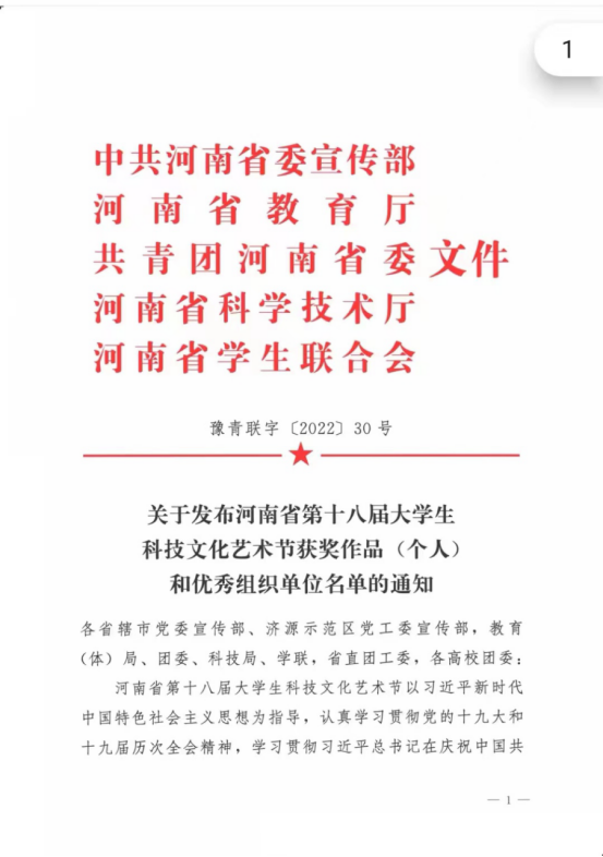 本网讯(文/校团委 古婵婵)近日,中共河南省委宣传部、河南省教育厅、河南省文化和旅游厅、共青团河南省委、河南省科学技术厅、河南省学生联合会联合发布《关于发布河南省第十八届大学生网上科技文化艺术节获奖作品(个人)和优秀组织单位名单的通知》,我校成绩斐然,共16项参赛作品获奖,其中二等奖1项,三等奖12项,优秀奖3项。