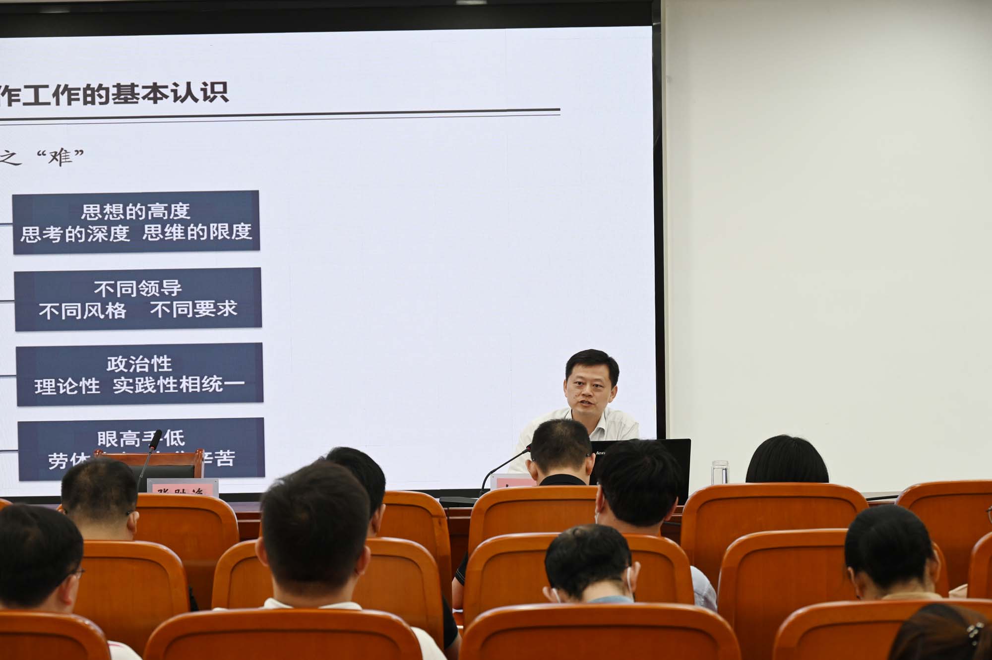 开班仪式上,党委委员、副校长张胜海结合自身经历,勉励大家端正学习态度、丢弃思想包袱、踏实学习知识、努力提升水平,实现从“我得写”到“我想写”,从“我能写”到“我写得好”的完美蜕变。李康以《关于综合性文稿创作工作的基本认识》为题,从综合性文稿创作工作的基本认识、要点难点和实战案例三个方面,详细介绍了公文撰写的方式方法和注意事项。颜英利以《如何写好公文》为题,从自身工作经验出发,讲授了“公文写作六步法”,分享了常用公文文种的撰写心得。王春阳以《新时代公文撰写的几点难处》为题,深入剖析了公文写作的难点和成长阶段,鼓励大家要厚积善悟,多听多写,不断提升自身素养,撰写“短”“实”“新”的新时代公文。培训会后,为参训学员留下写作测试以检验学习效果。