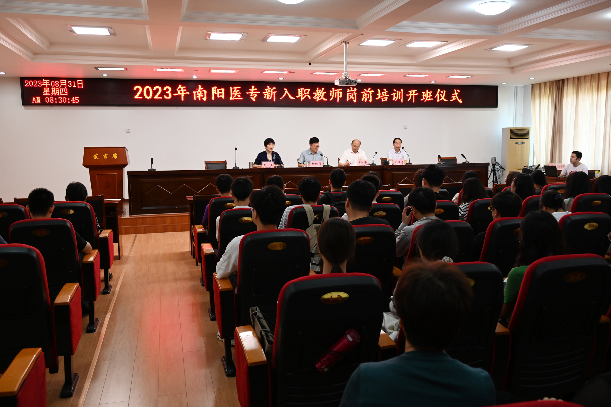 8月31日上午,开班仪式在一号办公楼5楼会议室举行。校党委书记柳明伟,校党委委员张胜海,校党委委员、副校长范真、刘荣志出席,各系(部、院)主管教学工作的领导及全体2023年新入职教师参加。