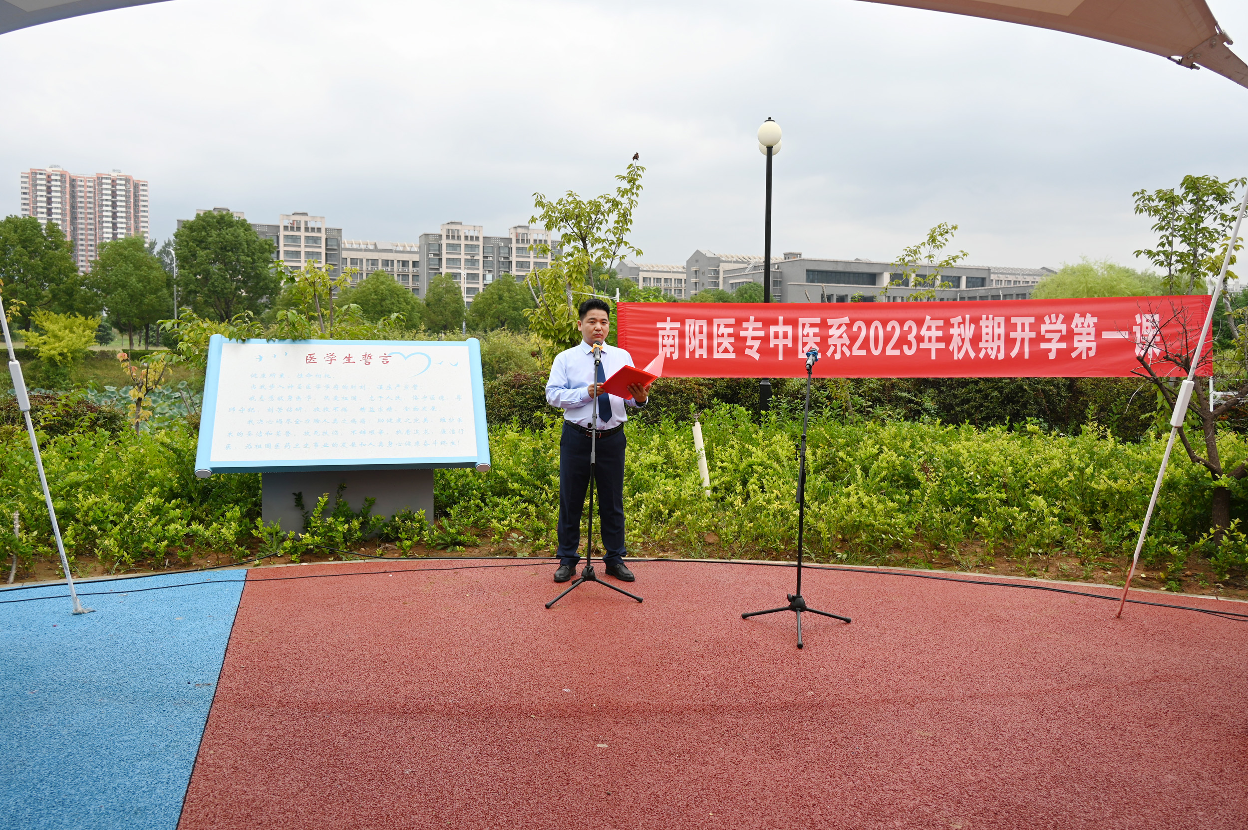 本网讯(中医系 刘元)2023年9月27日下午,南阳医专中医系2023年秋期开学第一课在仲景东区隆重举行。校长范真、宣传部部长李红普、中医系书记郭玉伟、主任张明丽与中医系全体师生齐聚仲景湖畔,同上一堂“沉浸式”思政大课。