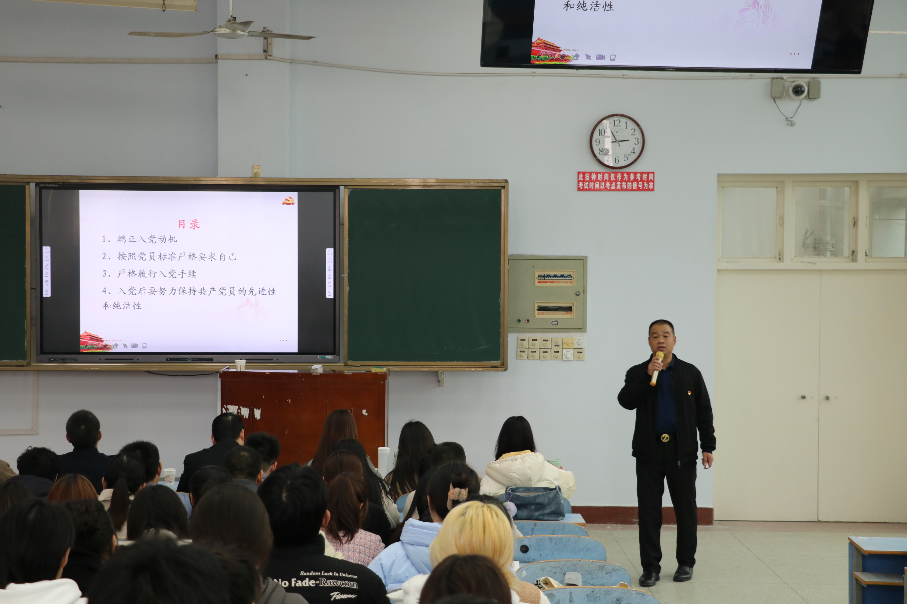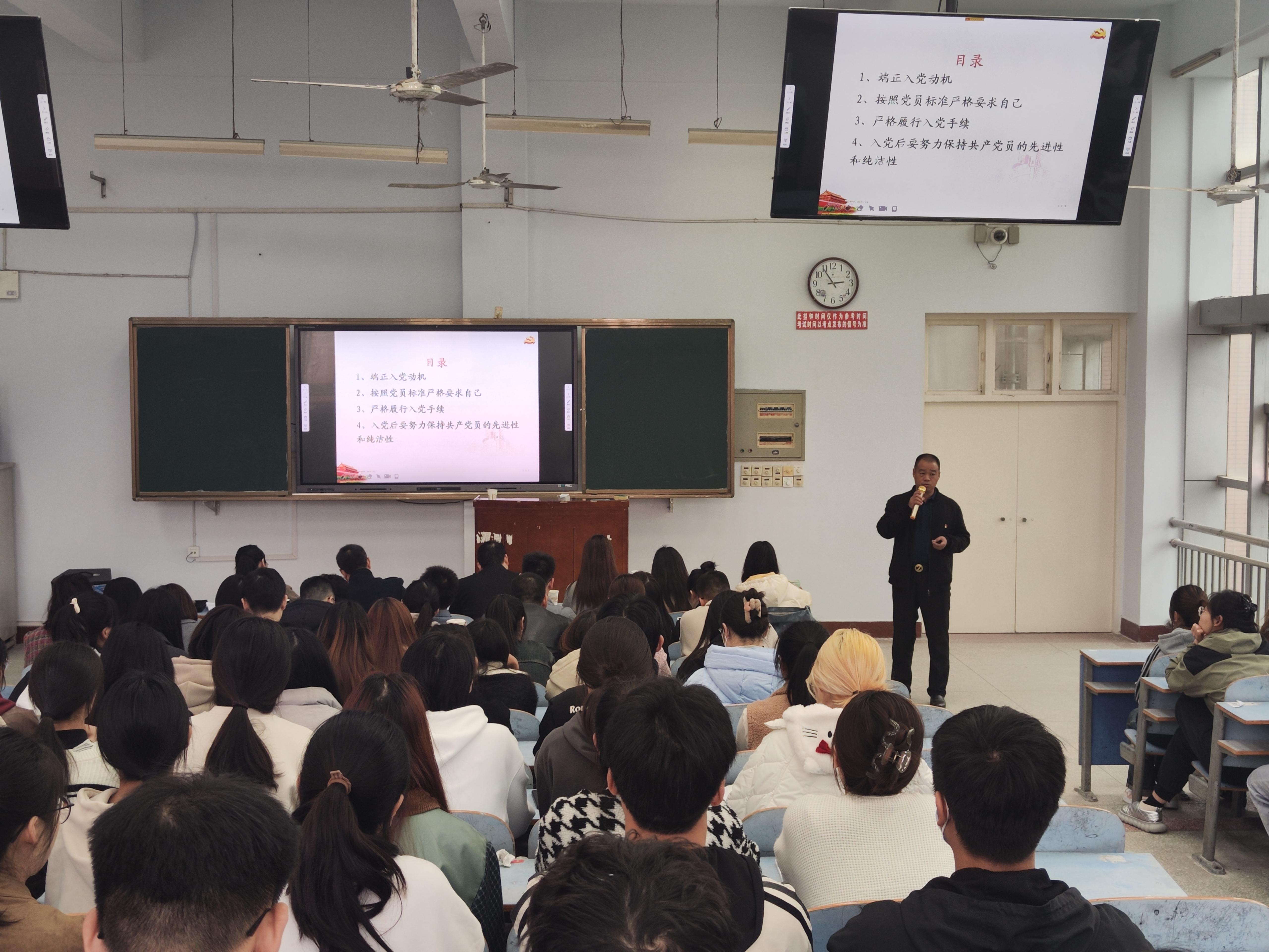秦玖刚以《以实际行动争取做一名合格的共产党员》为题,从四个方面进行讲授。一是端正入党动机,是入党的首要问题,有了正确的入党动机,才能正确地指导行动。二是按照党员标准严格要求自己,必须全面理解党章规定的党员标准,用党员标准规范自己的思想和行为。三是严格履行入党手续,从递交入党申请书到预备期满转正,每一个步骤都必须严格遵守,认真接受党组织的培训以及正确对待党组织的考察。四是入党后要努力保持共产党员的先进性和纯洁性。入党后要努力从坚定理想信念、牢记党的宗旨、坚持勤奋学习、积极努力工作、自觉遵守纪律、永葆政治本色六个方面保持共产党员的先进性和纯洁性。