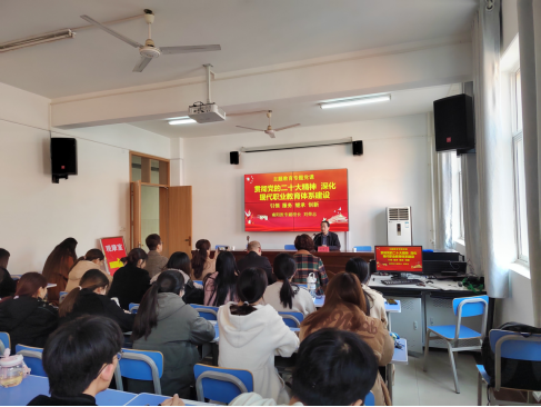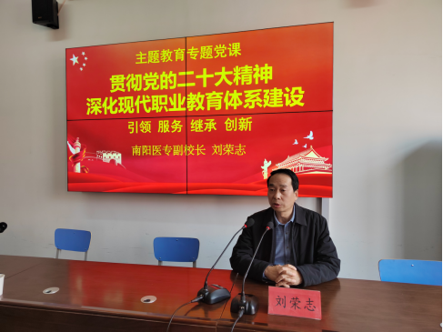 本网讯(文/基础部 连云峰)为推动学习贯彻习近平新时代中国特色社会主义思想主题教育走深走实,11月22日下午,在实验楼七楼会议室,校党委委员、副校长刘荣志以《学习宣传贯彻党的二十大精神,深化现代职业教育体系建设》为题,为基础医学部全体教师上主题教育专题党课。