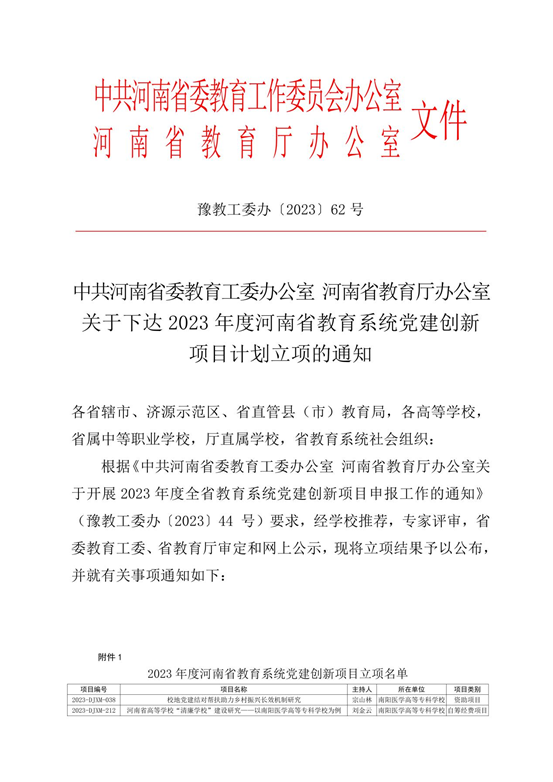 本网讯(文/临床医学系 王静)近日,中共河南省委教育工委办公室、河南省教育厅办公室下发2023年度河南省教育系统党建创新项目计划立项的通知,我校《校地党建结对帮扶助力乡村振兴长效机制研究》和《河南省高等学校“清廉学校”建设研究——以VK电竞(中国),亚洲电竞先驱为例》两个项目获批立项。
