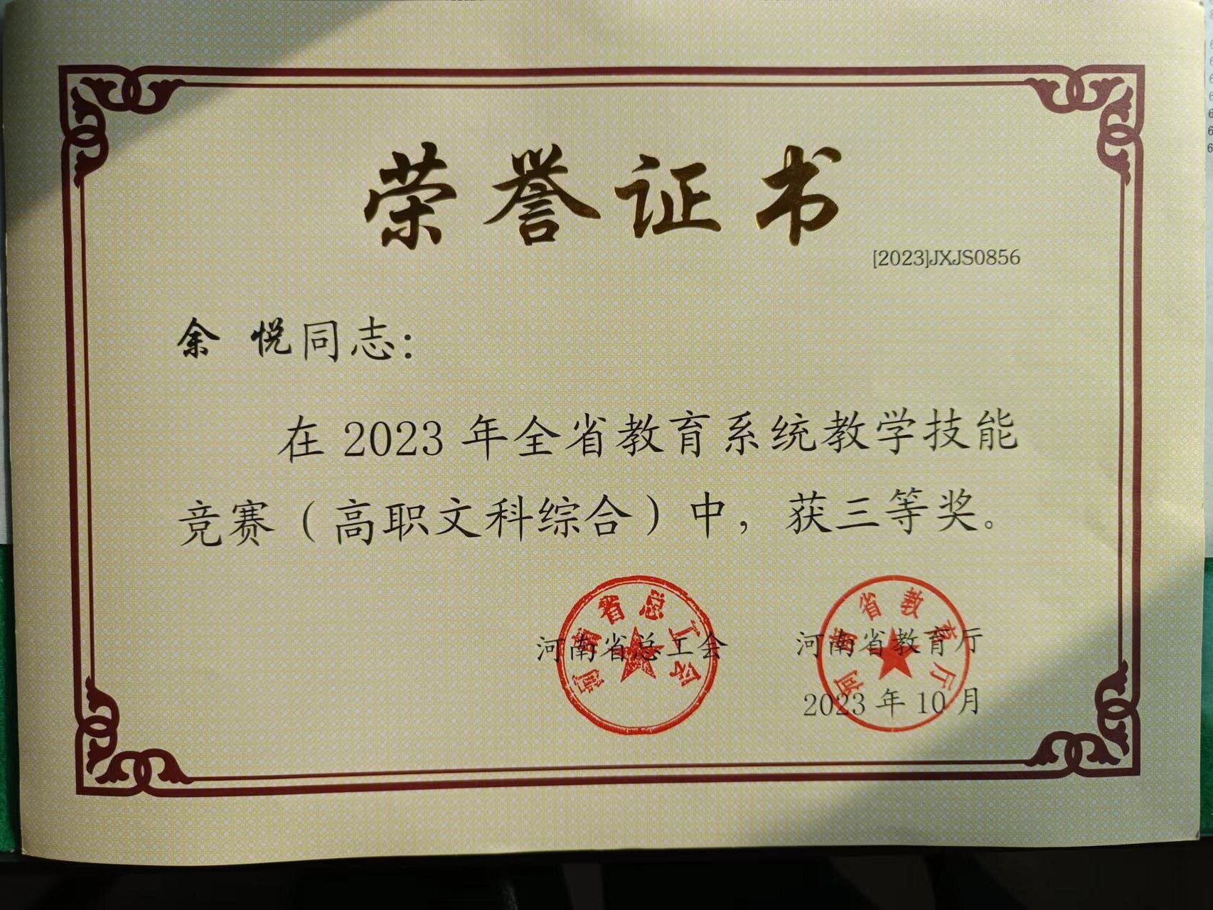 本网讯(文/校工会 程小果)近日,河南省总工会、河南省教育厅公布了《关于2023年河南省教学技能竞赛获奖情况的通报》(豫工文〔2023〕107号),我校康复医学系张迪老师获得高校医科类一等奖,体育教学部李俊杰老师获得高职文科综合类一等奖,两位老师均荣获“河南省优秀教学标兵”称号;卫生管理系蔡金伟老师获得高职文科综合类二等奖,公共教学部余悦老师获得高职文科综合类三等奖。