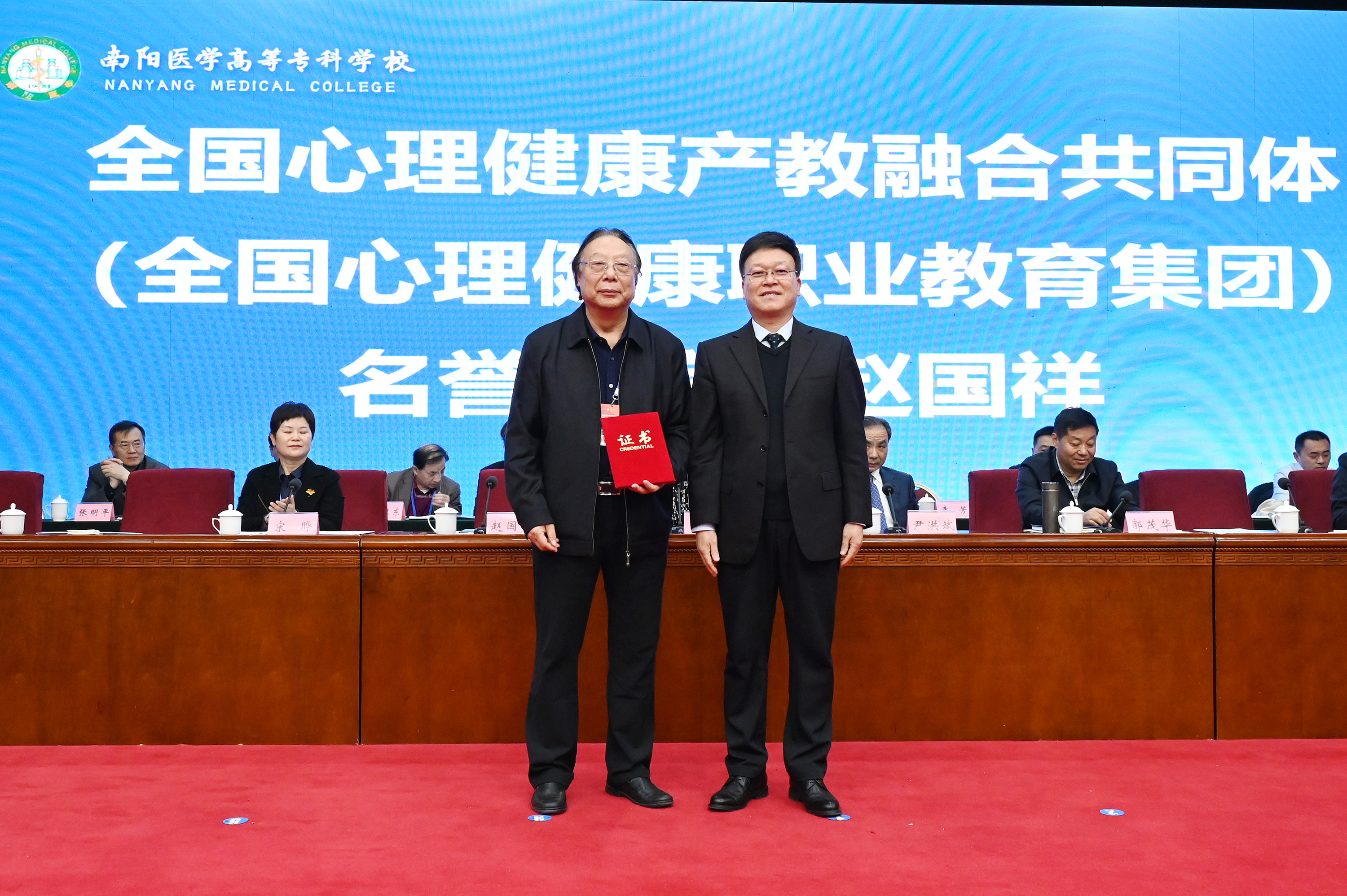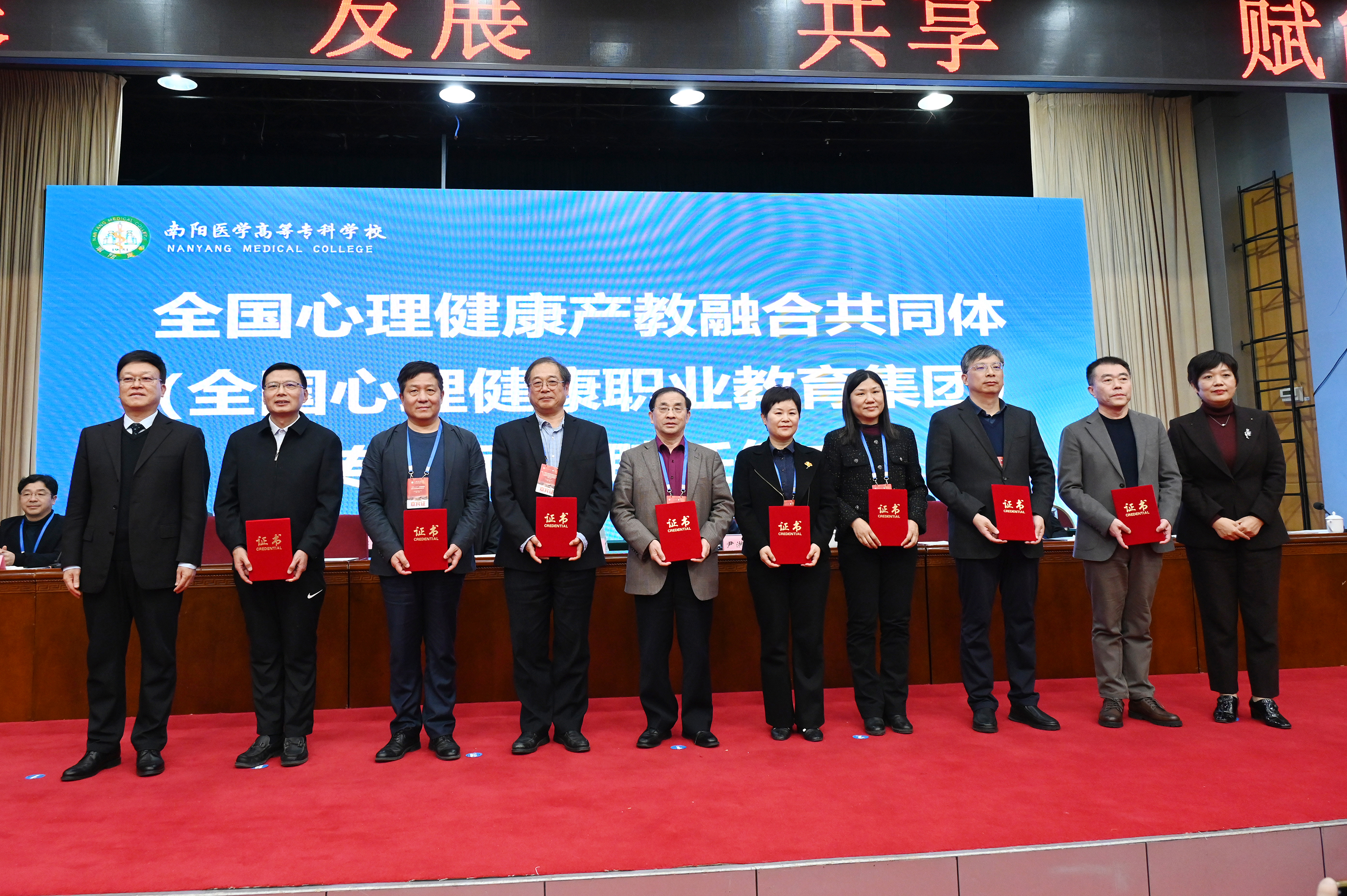 姜雯、尹洪斌、赵国祥、郭茂华、宋晔、柳明伟、范真及与会嘉宾代表宣布全国心理健康产教融合共同体(全国心理健康职业教育集团)成立。河南师范大学副校长宋晔对共同体成立予以祝贺,表示将与南阳医专等兄弟院校一起致力于全国心理健康产教融合共同体建设。柳明伟向全国心理健康产教融合共同体(全国心理健康职业教育集团)名誉主席赵国祥教授颁发聘书,柳明伟、范真共同为国家中医药管理局中医心理学重点学科与重点专科带头人、中国中医科学院首席研究员汪卫东,中国心理学会副监事长赵俊峰,教育部心理学类教学指导委员会副主任委员、北京师范大学心理学部教授、博士生导师林丹华等全国心理健康产教融合共同体专家顾问颁发聘书。会上宣读了《职业教育心理健康公益活动倡议书》,发布了全国心理健康产教融合共同体理事会名单,河南师范大学、江西师范大学担任名誉理事长单位,VK电竞(中国),亚洲电竞先驱、临沂职业学院、山东菏泽信息工程学校担任理事长单位,河南大河医疗集团担任监事长单位。