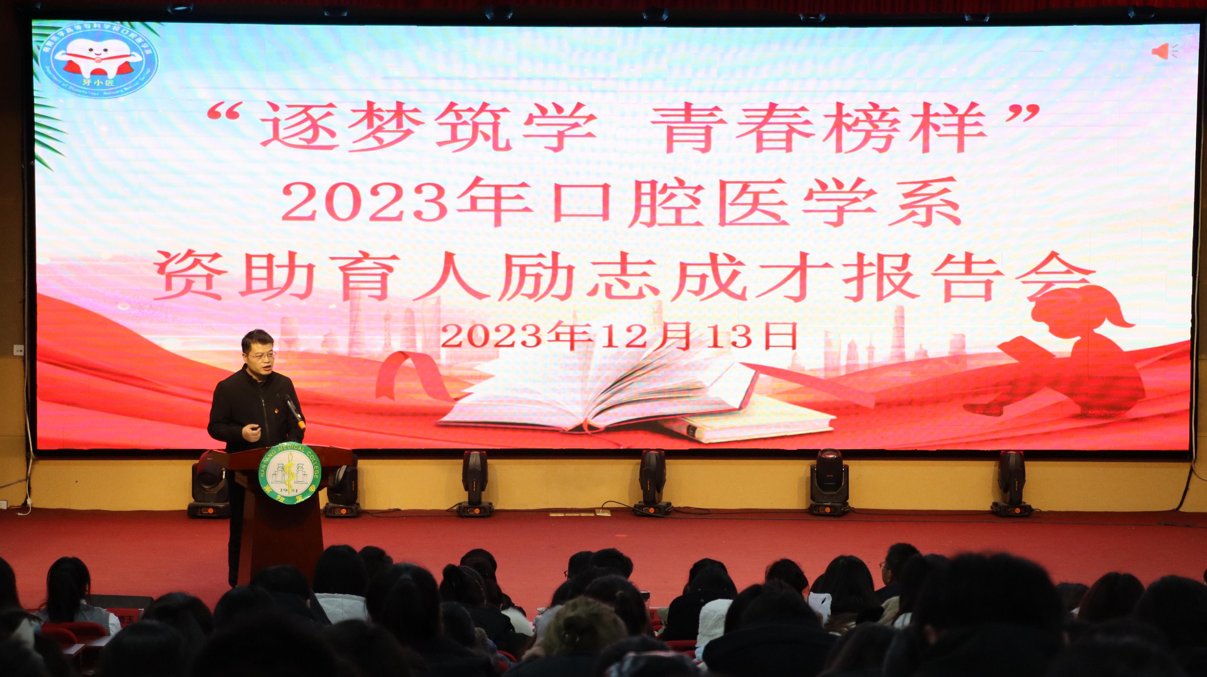 本网讯(文/口腔医学系 雷云)为加强感恩励志教育,激发学生发奋学习的强大动力,12月13日晚,口腔医学系在仲景东区报告厅举办“逐梦筑学,青春榜样”资助育人励志成才报告会。校党委副书记刘涛、学生处副处长吴东波出席会议,口腔医学系行管人员及400余名学生参加会议。