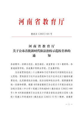 本网讯(文/法制办 田秀芳)近日,省教育厅下发《关于公布首批新时代依法治校示范校名单的通知》,经过各高校自愿申报、专家评审、网络答辩、实地抽查、征求意见、综合评议和公示等环节,全省19所高校入围(本科15所,高职高专4所),学校获评“河南省首批新时代依法治校示范校”荣誉称号。