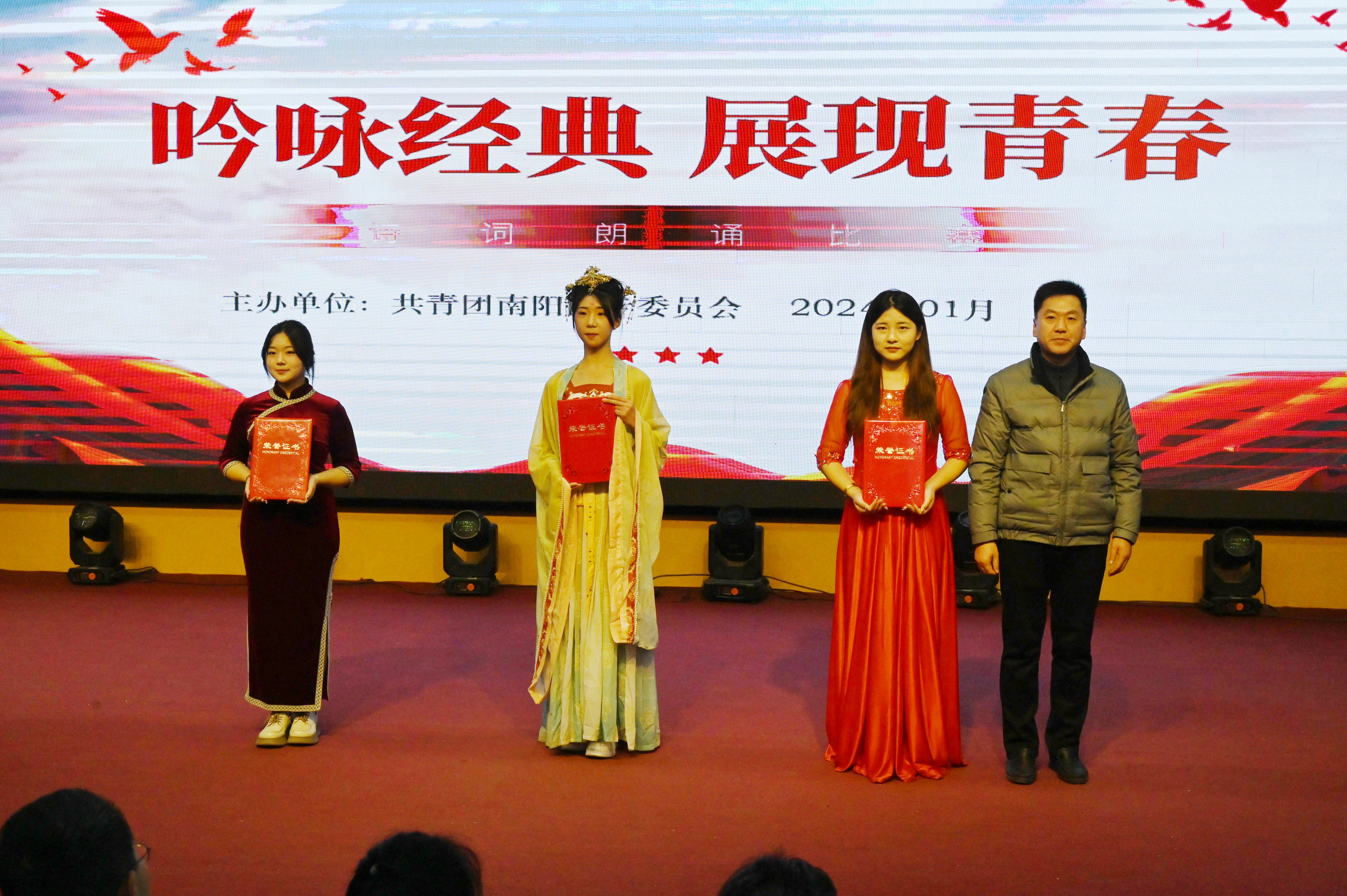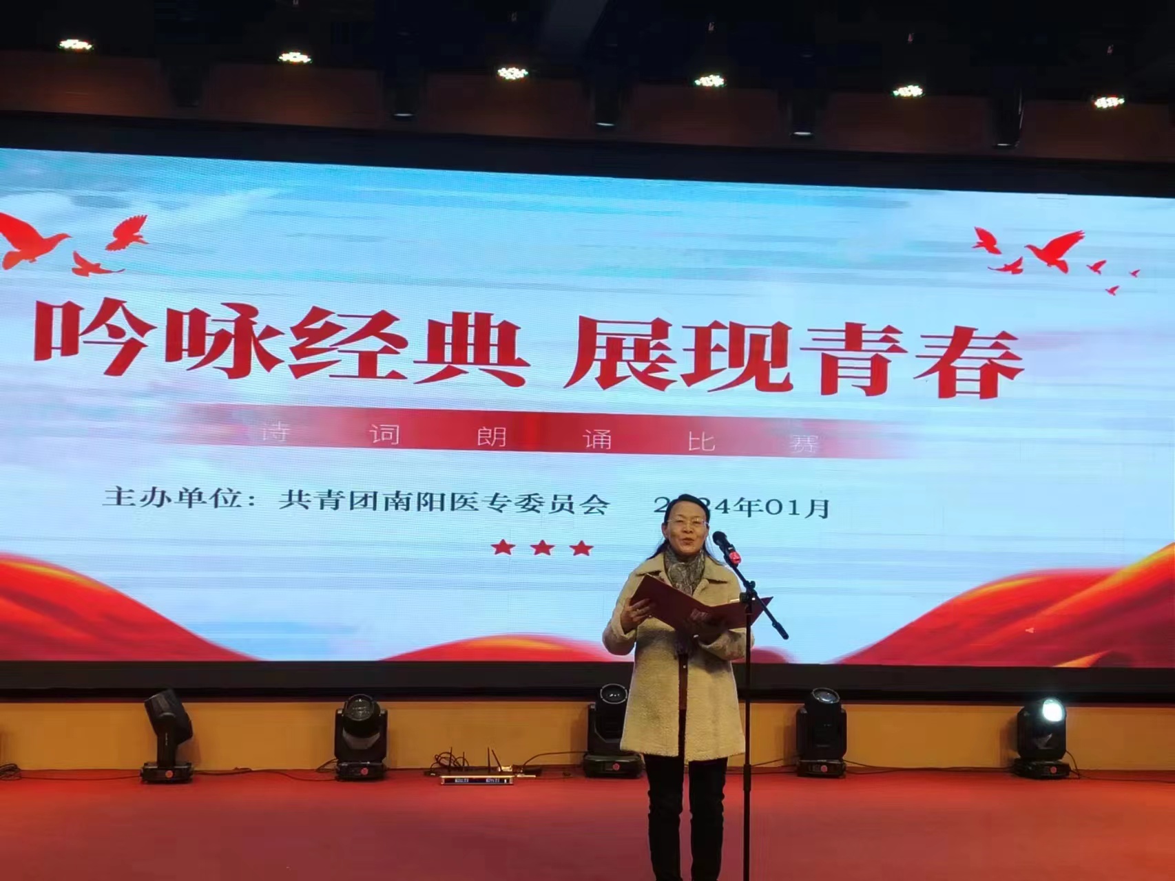 本网讯(文/校团委 马黎莉)1月3日下午,南阳医专“吟咏经典 展现青春”诗词朗诵大赛在仲景东区礼堂二楼报告厅隆重举行。校党委委员、工会主席杜晓平、宣传部部长李红普、工会副主席库建伟、就业创业处处长刘鹏、团委刘怀东及各系(院)党总支书记出席了本次活动。