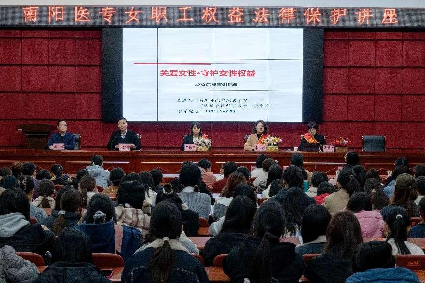 本网讯(文/校工会 田园)为深入学习宣传贯彻习近平法治思想,学习宣传贯彻中国工会十八大和河南省工会十六大精神,推动男女平等基本国策贯彻落实,大力营造全面维护女职工权益的良好氛围,3月13日下午,校工会女工委、法制办联合举办女职工权益法律保护讲座,邀请南阳市巾帼公益律师团讲解女职工权益保障相关法律法规。校党委委员、工会主席杜晓平出席,校女职工、学生代表约200人参加。