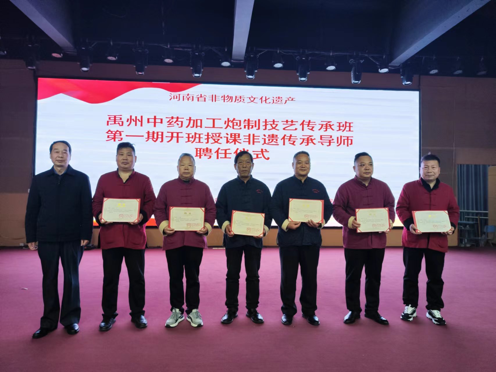 刘荣志为第一期开班授课的非遗传承导师逯安新、黄潇、李敏生、朱有国、许宗辉和王超伟六位大师颁发了非物质文化遗产传承导师聘书,杨明勋和逯安新共同为禹州药工(南阳)工作室揭牌。杨明勋鼓励学员们能够熟练掌握中药炮制技艺,成为非遗文化传承的中坚力量,希望学员们能够将所学知识和技能运用到实际工作中,为中医药事业的发展贡献自己的力量。