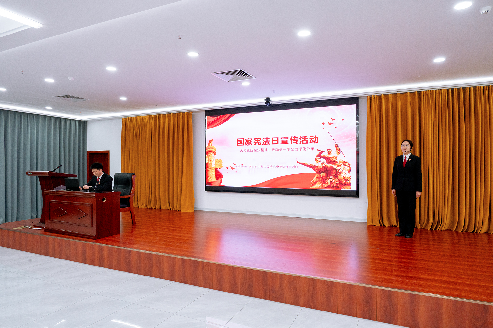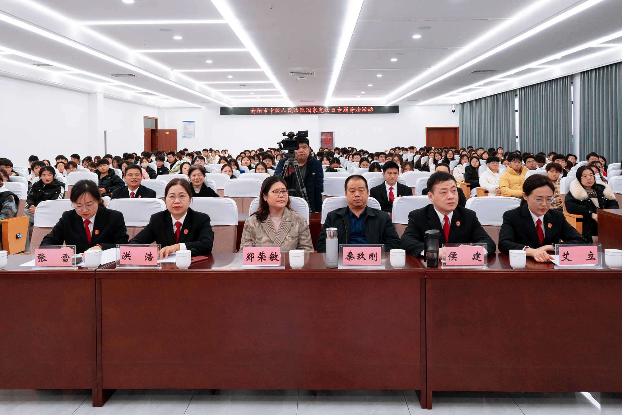 本网讯(文/法制办 张斌)为强化师生法治观念,积极推进平安校园建设,在第十一个国家宪法日来临之际,12月3日,我校邀请南阳市中级人民法院审判委员会委员、三级法官郑荣敏带领少年综合审判庭全体成员来校,开展了宪法及大学生常见涉法问题法治教育讲座。校党委委员、副校长秦玖刚致欢迎辞,法制办全体同志及各涉学系(部、院)学工办主任、辅导员代表、学生代表等300余人参加讲座。