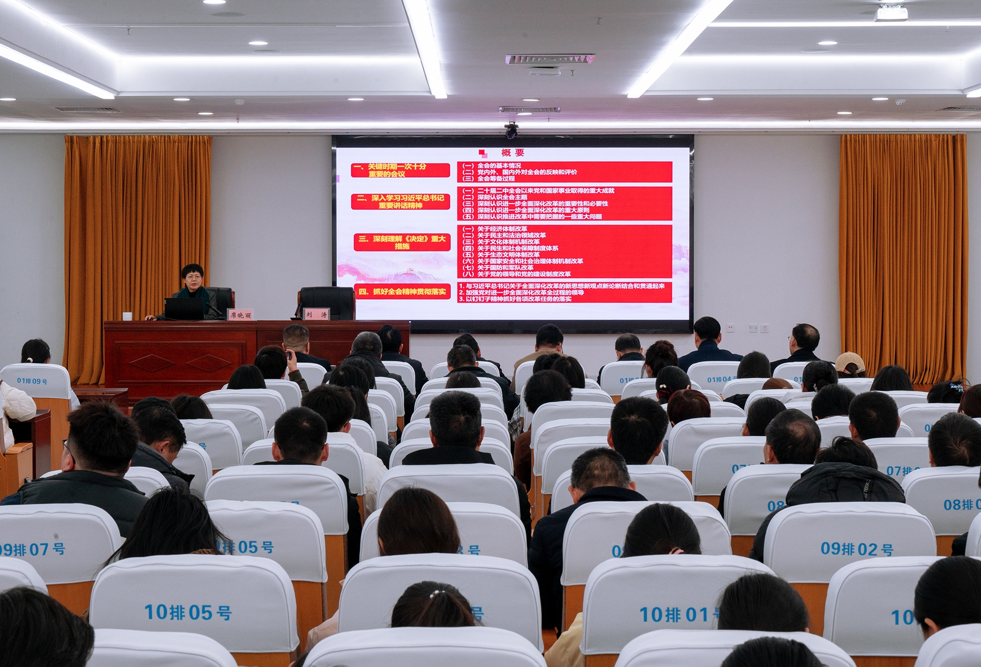 本网讯(文/宣传部 陈铁良)为全面深入学习领会党的二十届三中全会精神,使党的创新理论最新成果融入高校思想政治工作,引导广大党员干部师生更好地用党的二十届三中全会精神武装头脑、指导实践、推动工作,根据省委教育工委、省教育厅统一安排部署,12月20日,我校在仲景东区仲景文化中心7楼报告厅举办党的二十届三中全会精神宣讲会,省委教育工委宣讲团成员、南阳师范学院党委宣传部部长席晓丽向我校师生宣讲党的二十届三中全会精神。学校中层正副职干部、全体思政课教师及学生代表共300余人参加会议。校党委副书记刘涛主持会议。